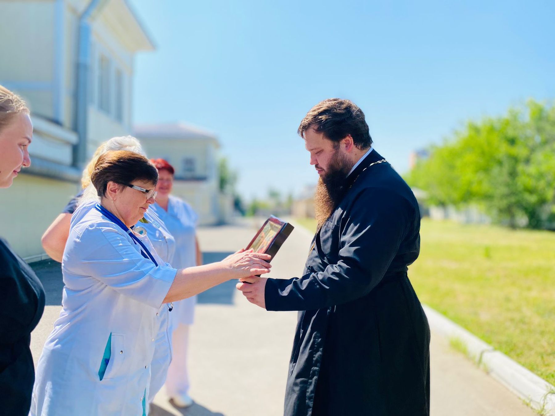 Батюшка поздравил сотрудников с наступающим Днём медицинского работника и передал в благословение заведующей отделением М. Ю. Шубиной икону Спасителя.