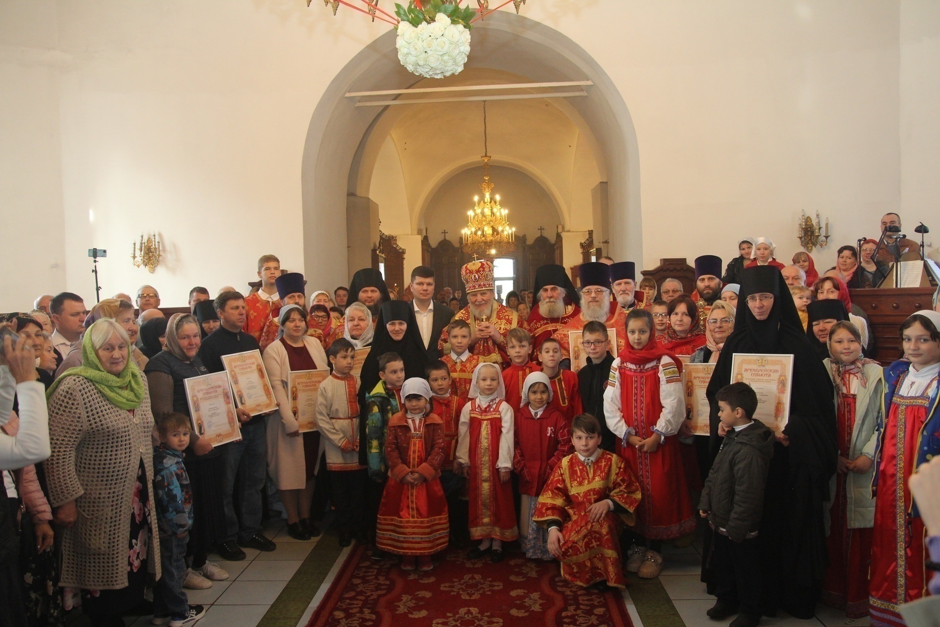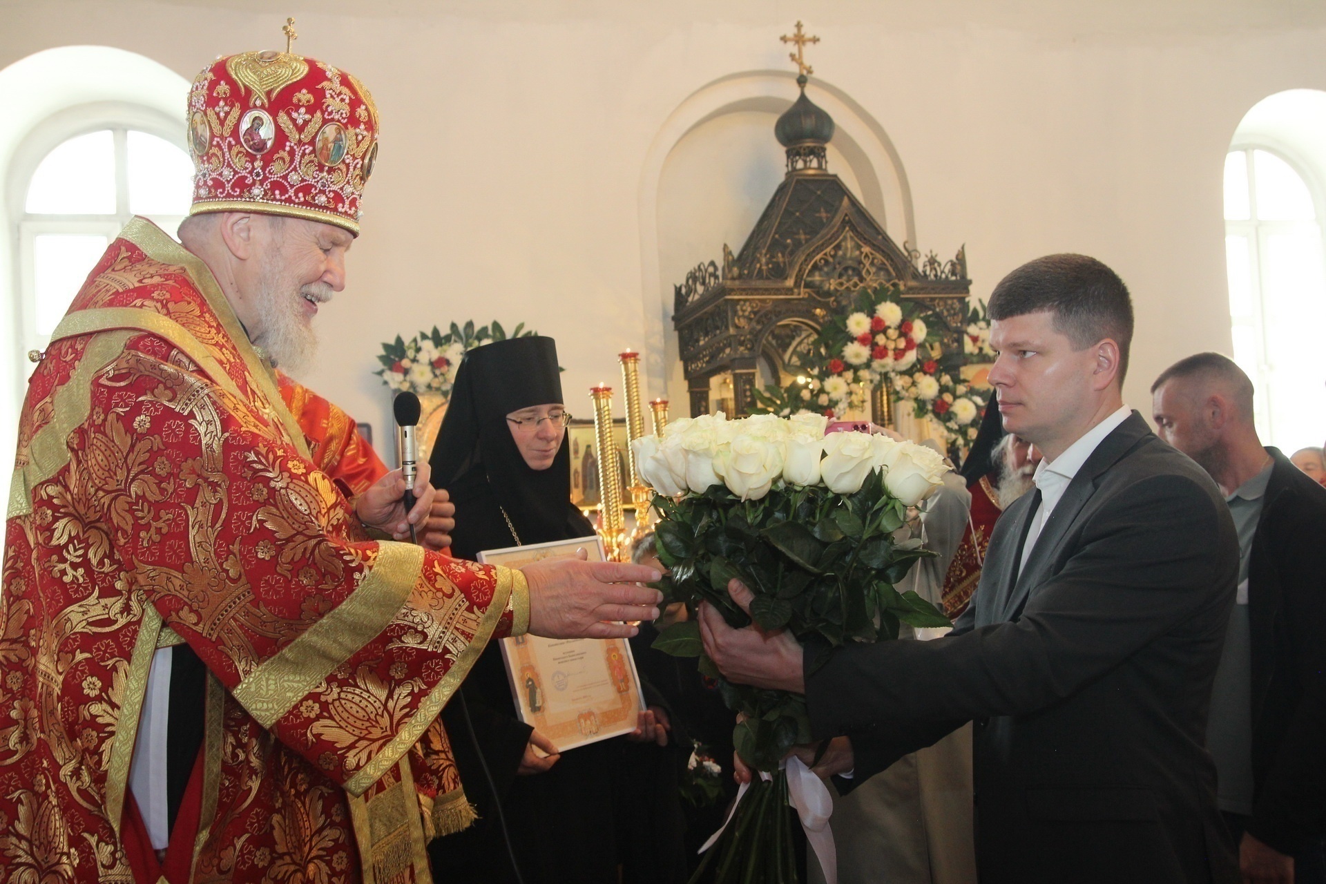 Затем Его Преосвященство преподал архиерейские грамоты благотворителям и прихожанам храма во внимание к жертвенным и усердным трудам во славу Божию и в связи с 30-летием со дня возобновления богослужебной жизни в храме, после чего обратился к сослужившему духовенству и молящимся с архипастырским словом.