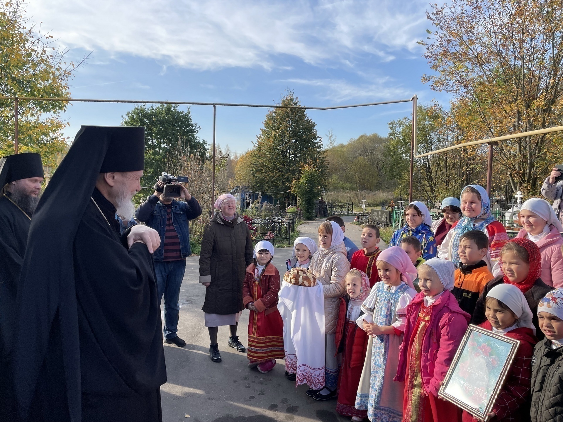 На паперти храма воспитанники детского корпуса «Никита» и учащиеся воскресной школы выступили с концертом и преподнесли в подарок Владыке Николаю изготовленную собственными руками картину.