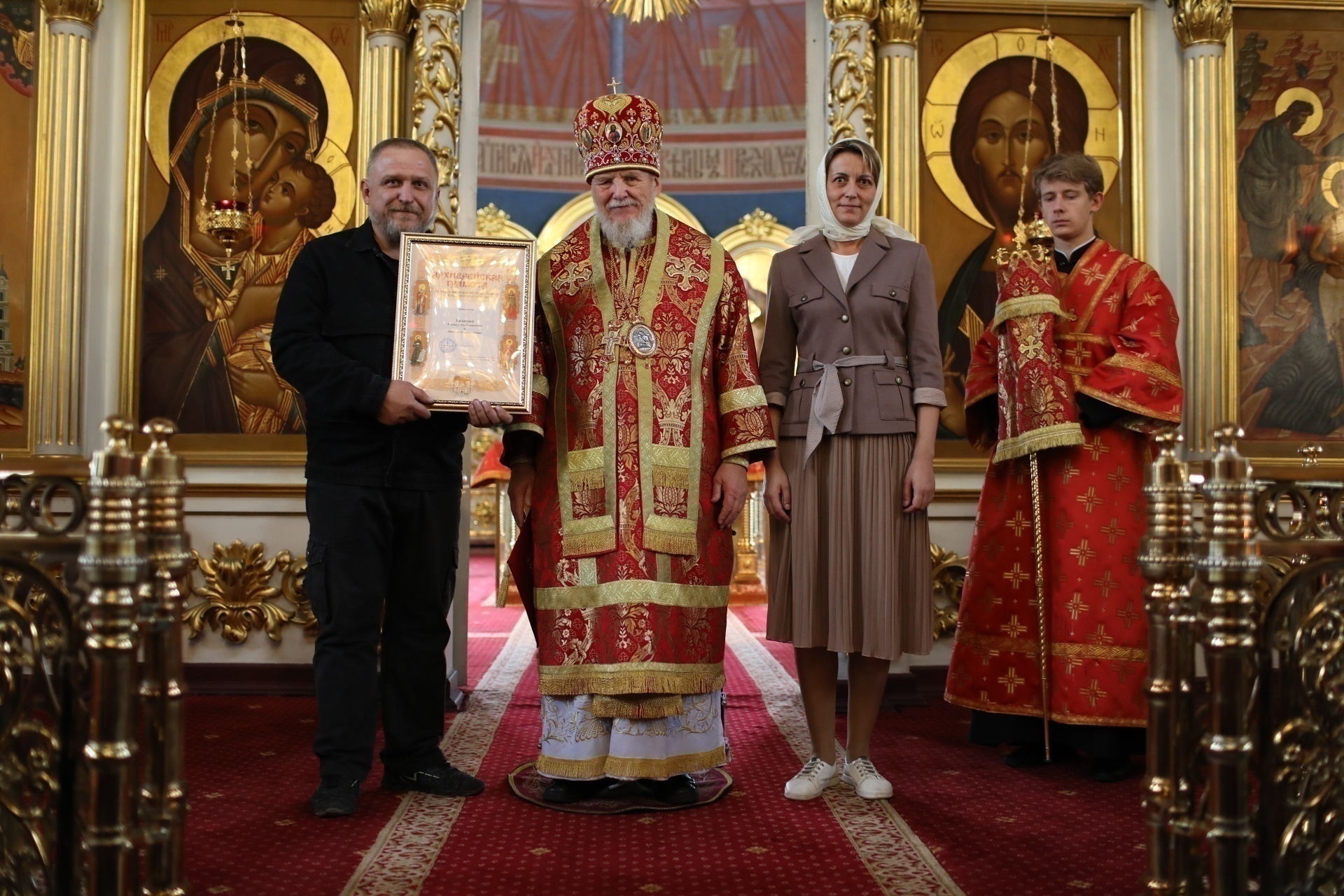 Затем Его Преосвященство преподал Архиерейские грамоты Балашихинской епархии прихожанам и труженикам собора, внёсшим значительный вклад в деятельность Оперативного штаба Балашихинской епархии по координации работы в сфере оказания пастырской и гуманитарной помощи пострадавшим мирным жителям и военнослужащим в зоне проведения специальной военной операции.