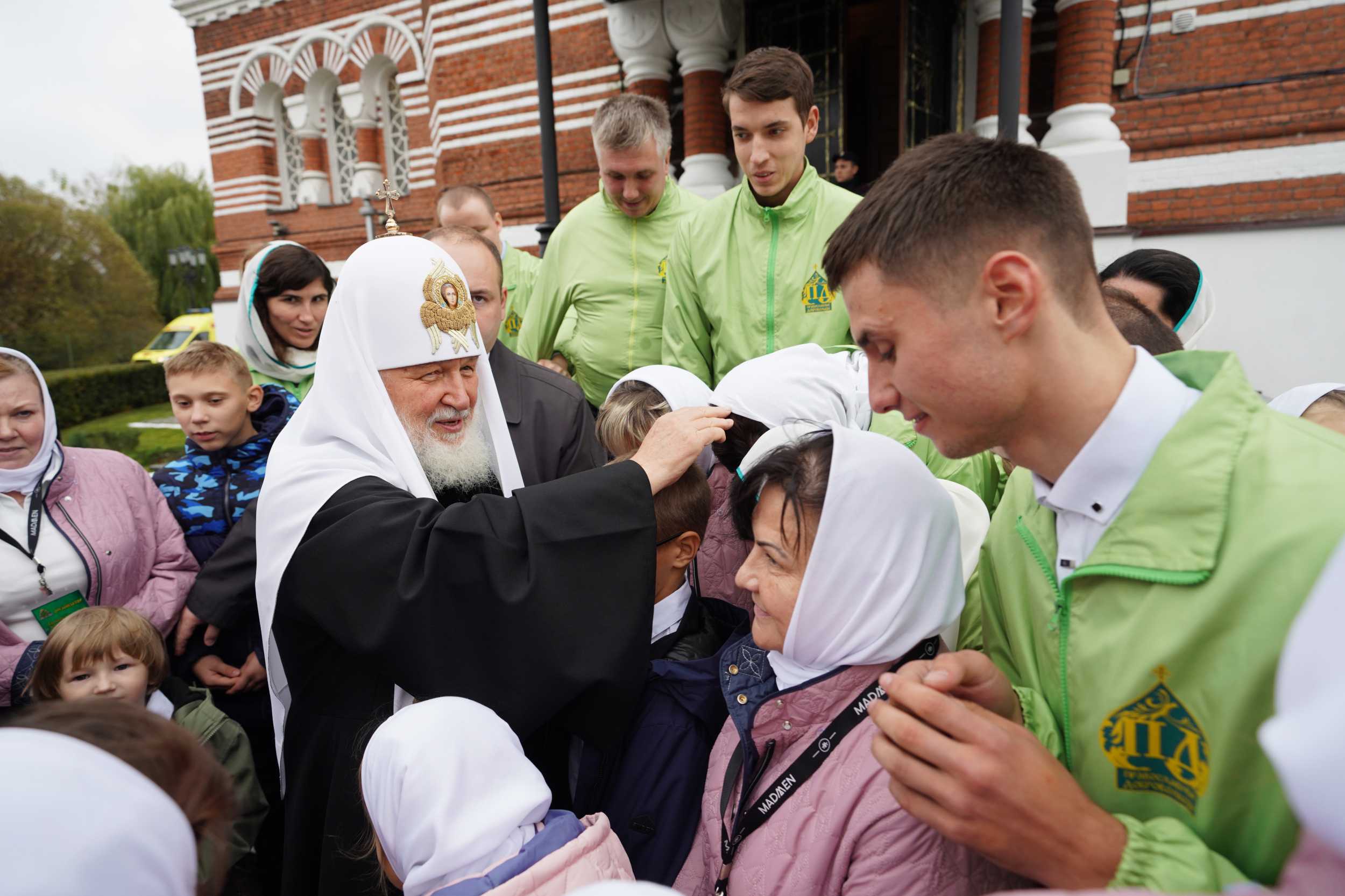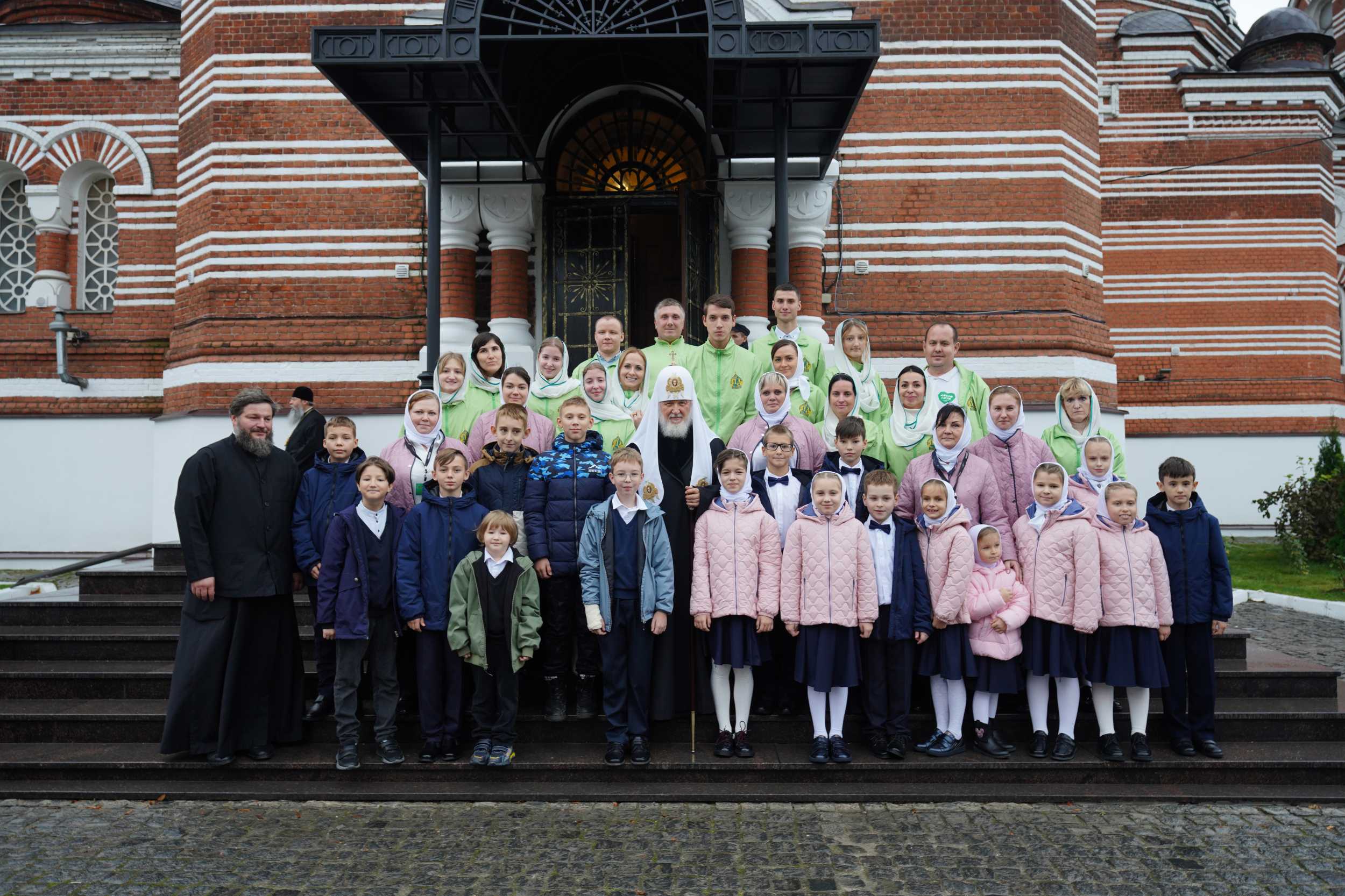 По окончании богослужения, выйдя из храма, Святейший Патриарх Московский и всея Руси Кирилл благословил представителей движения «Патриаршие добровольцы» и воспитанников православного детского социального центра при Троицком храме.