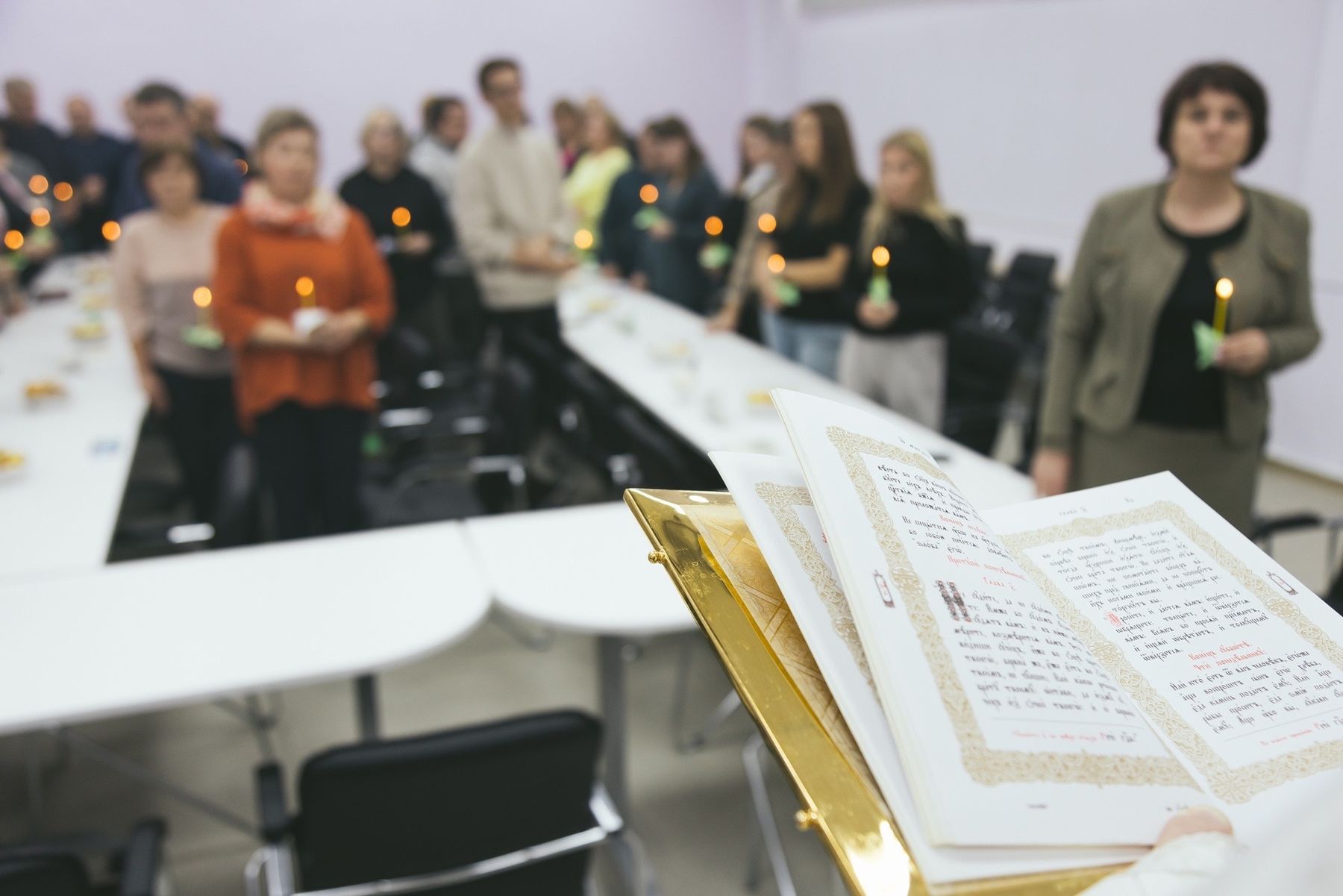 По окончании богослужения отец Александр обратился к коллективу учреждения с приветственным словом и передал директору Т. Е. Дугушкиной в благословение Нерукотворный образ Спасителя.