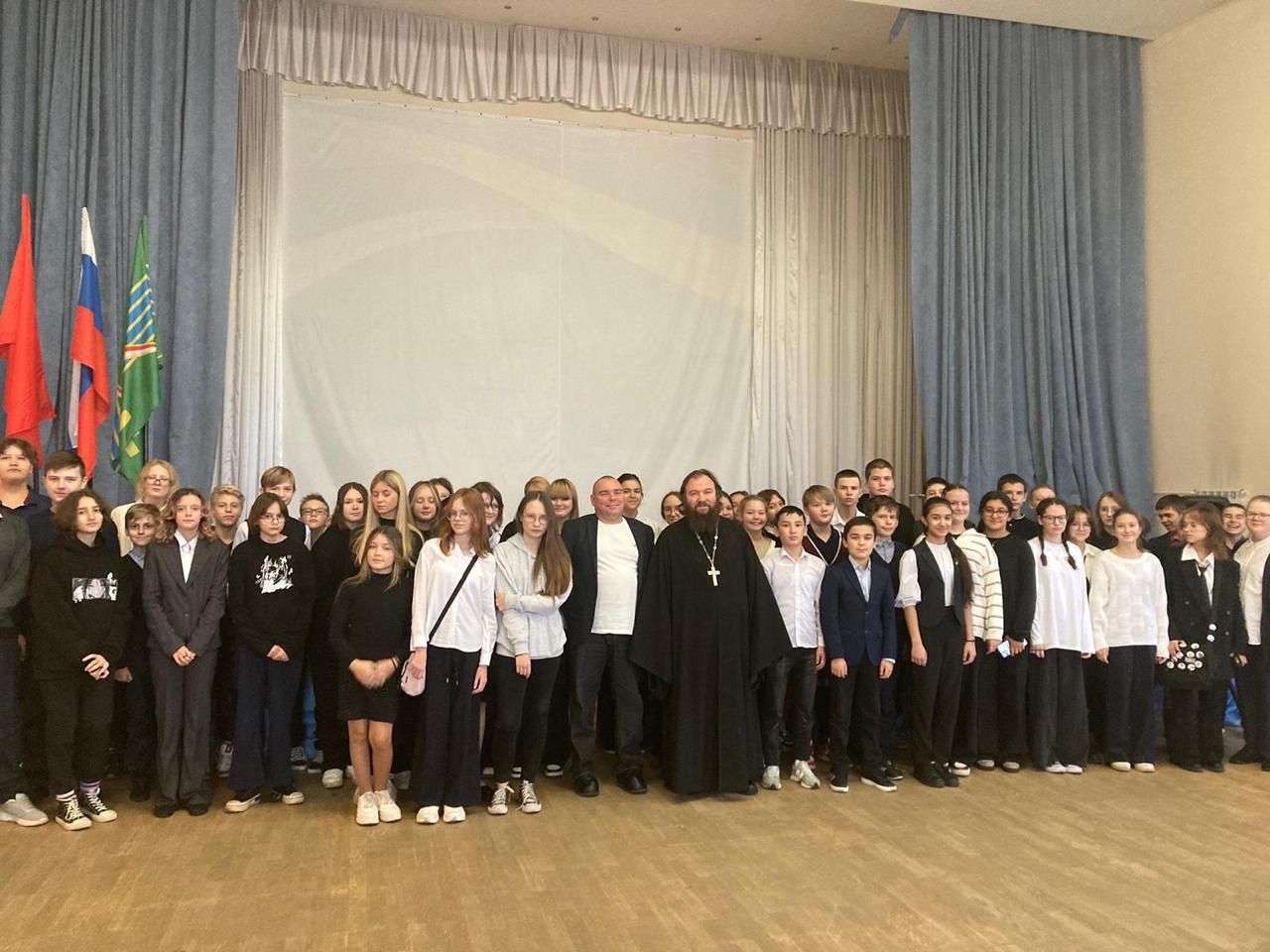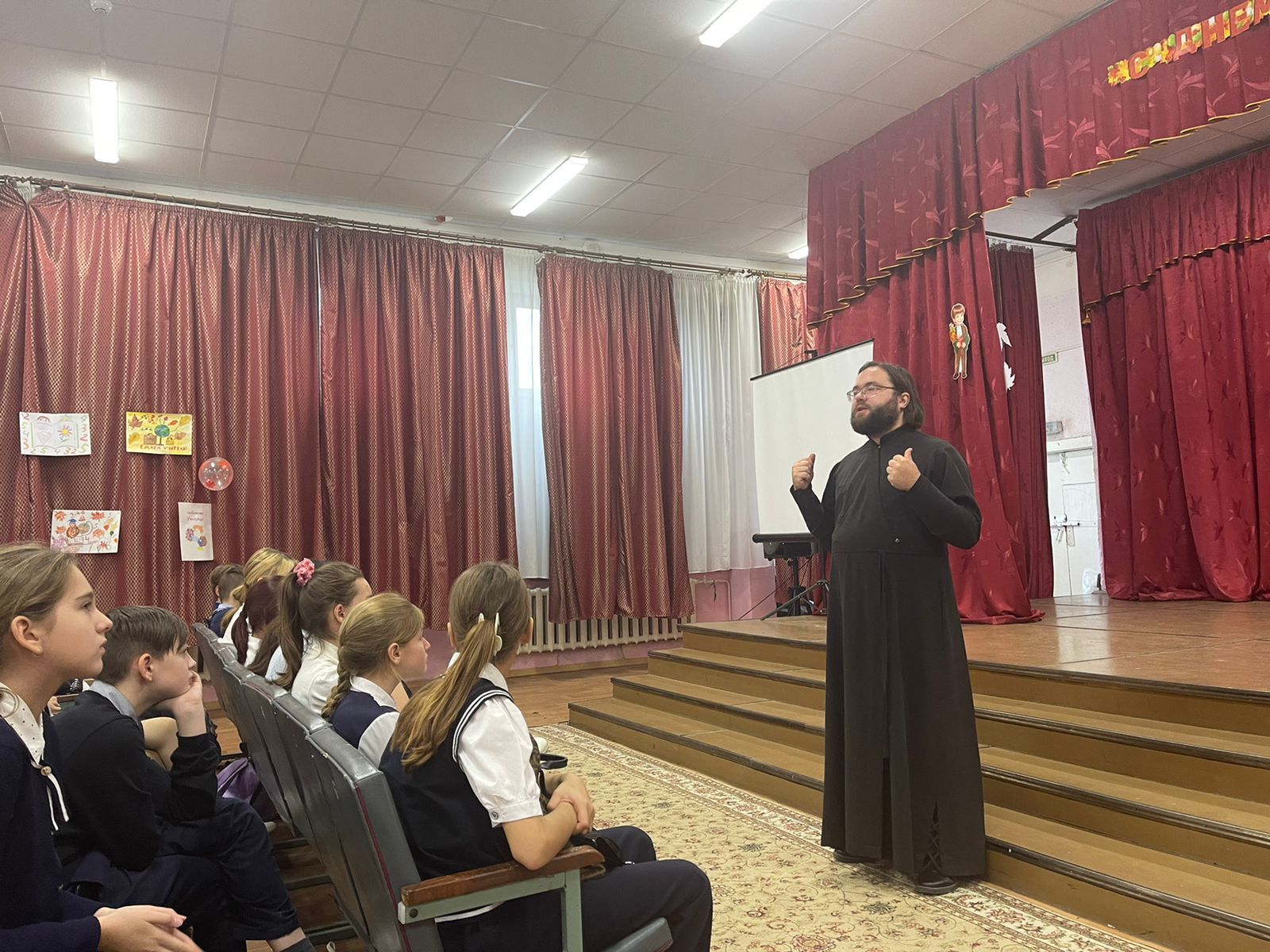 В этот же день в корпусе на улице Каляева школы №18 урок по основам Православной культуры провёл клирик Богородицерождественского храма деревни Саурово священник Алексий Кичаев.