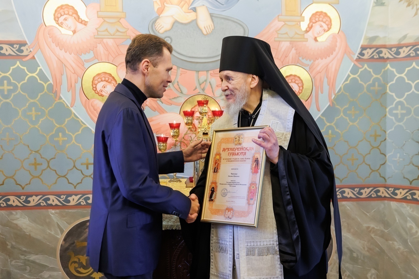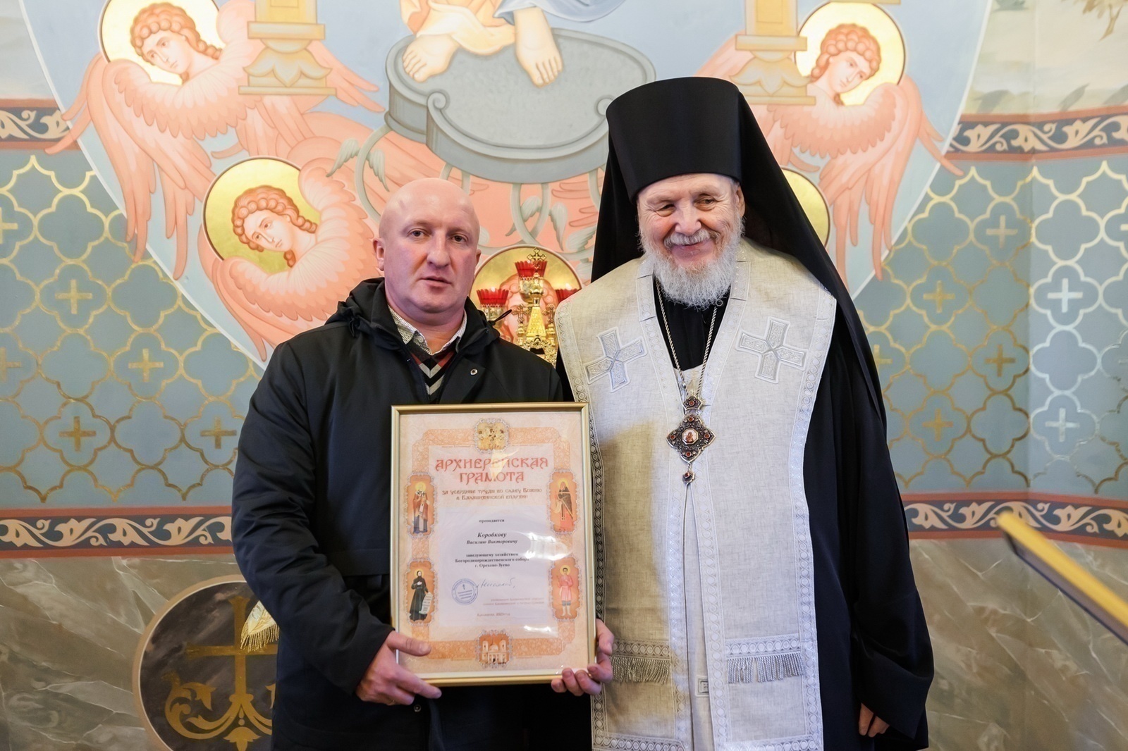 По окончании богослужения Его Преосвященство вручил благодарственное письмо за благотворительную помощь главе Орехово-Зуевского городского округа Р. В. Заголовацкому и Архиерейские грамоты Балашихинской епархии депутатам Государственной Думы VIII созыва Г. О. Панину и Н. Ю. Чаплину, заведующему по хозяйству Богородицерождественского собора города Орехово-Зуево В. В. Коробкову, бригадиру строительной бригады А. Н. Голованову и руководителю художественной-реставрационной мастерской «Templeart» С. Н. Антонову.