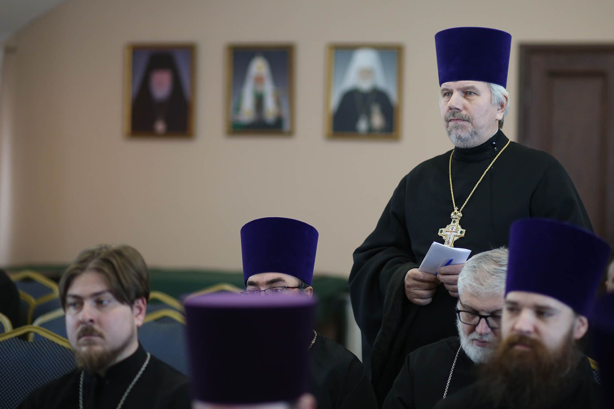 Благочинный Богородского церковного округа протоиерей Марк Ермолаев выступил с докладом и предложил поддержать обращение к правящему архиерею о новых назначениях помощников по внебогослужебным направлениям деятельности.
