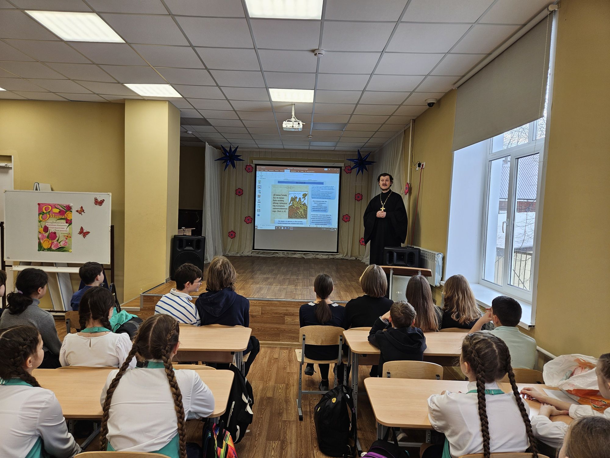 5 марта настоятель Богородицерождественского храма посёлка Образцово священник Димитрий Выдумкин провёл уроки с учащимися 5,6 и 7 классов в школе № 20 городского округа Щёлково на тему «Семья – основа государства».