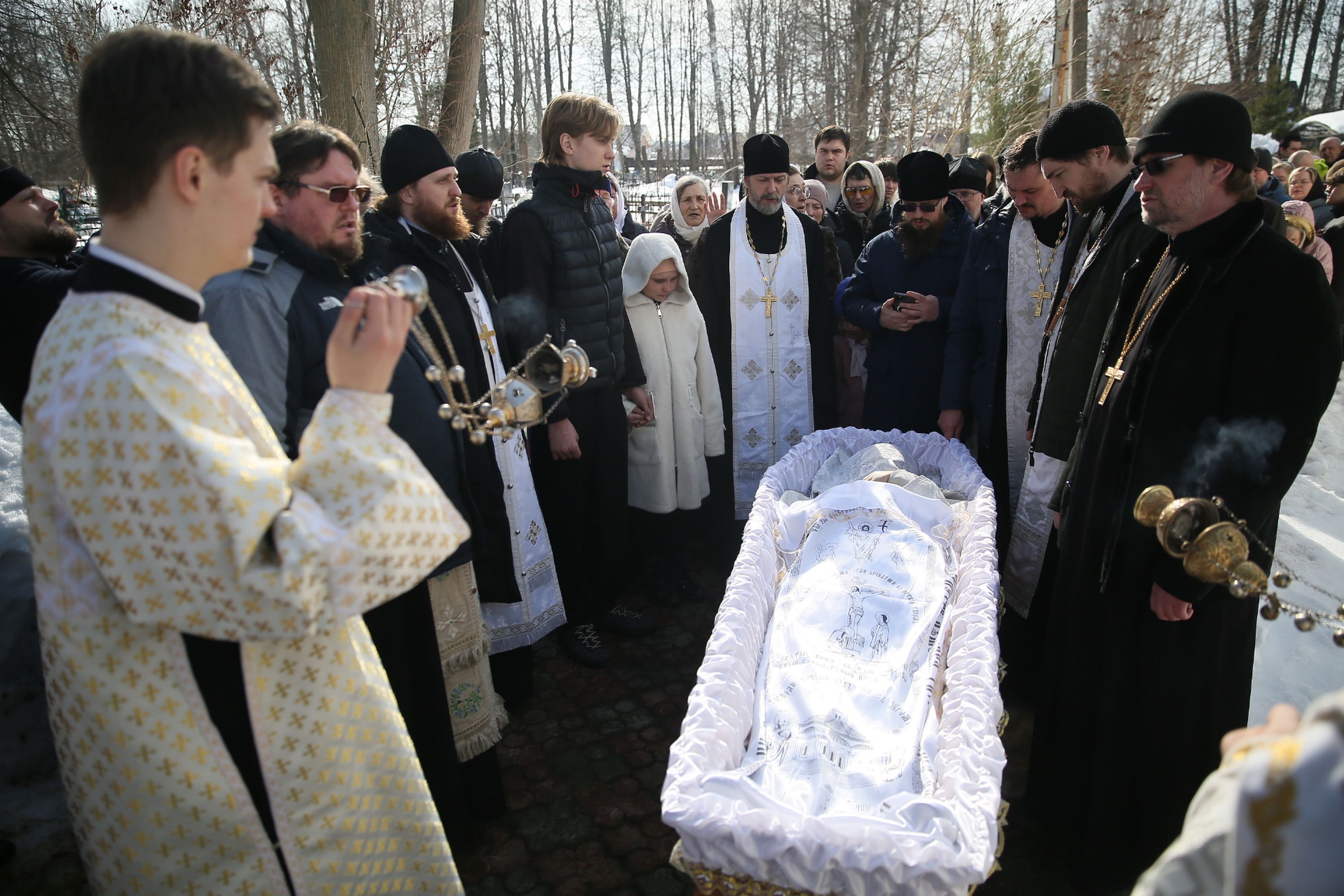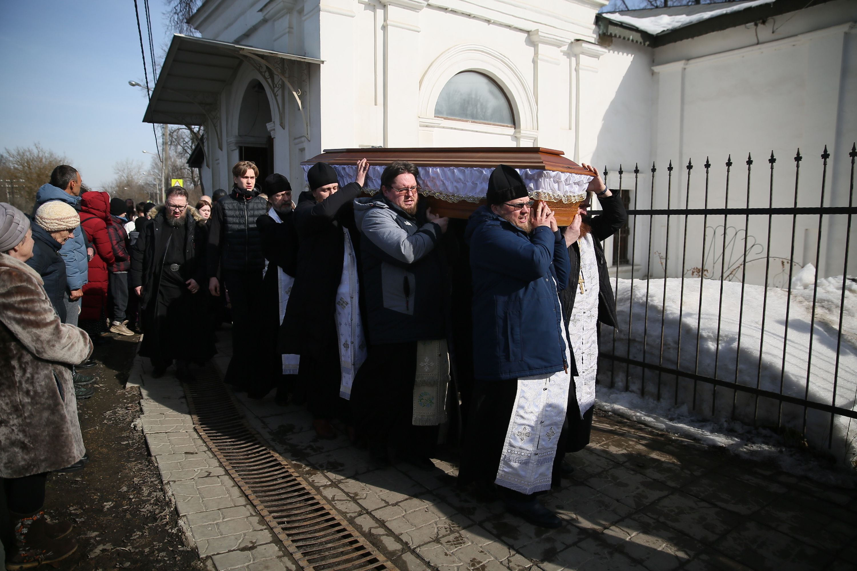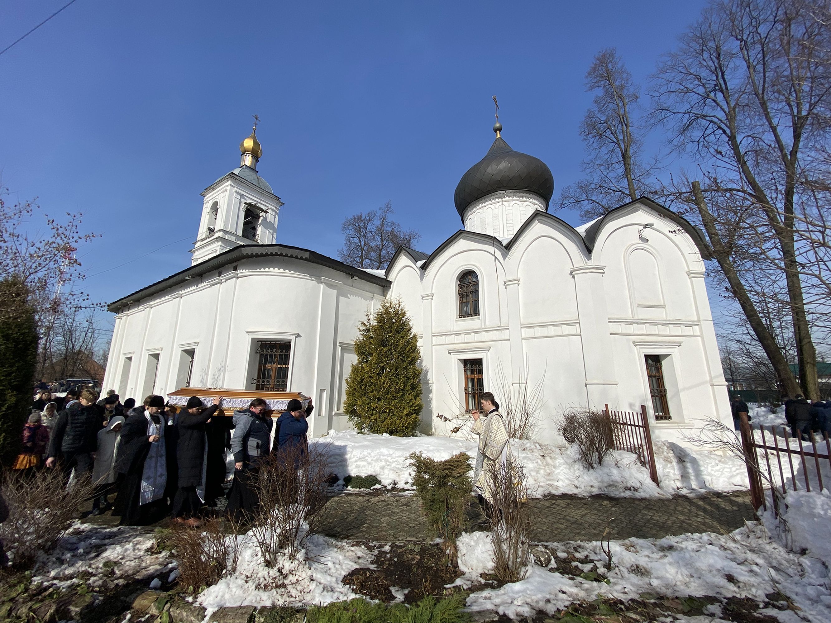 Гроб с телом почившего батюшки под колокольный звон и пасхальные песнопения был пронесён священнослужителями вокруг храма, а затем к месту погребения на кладбище за алтарём храма.