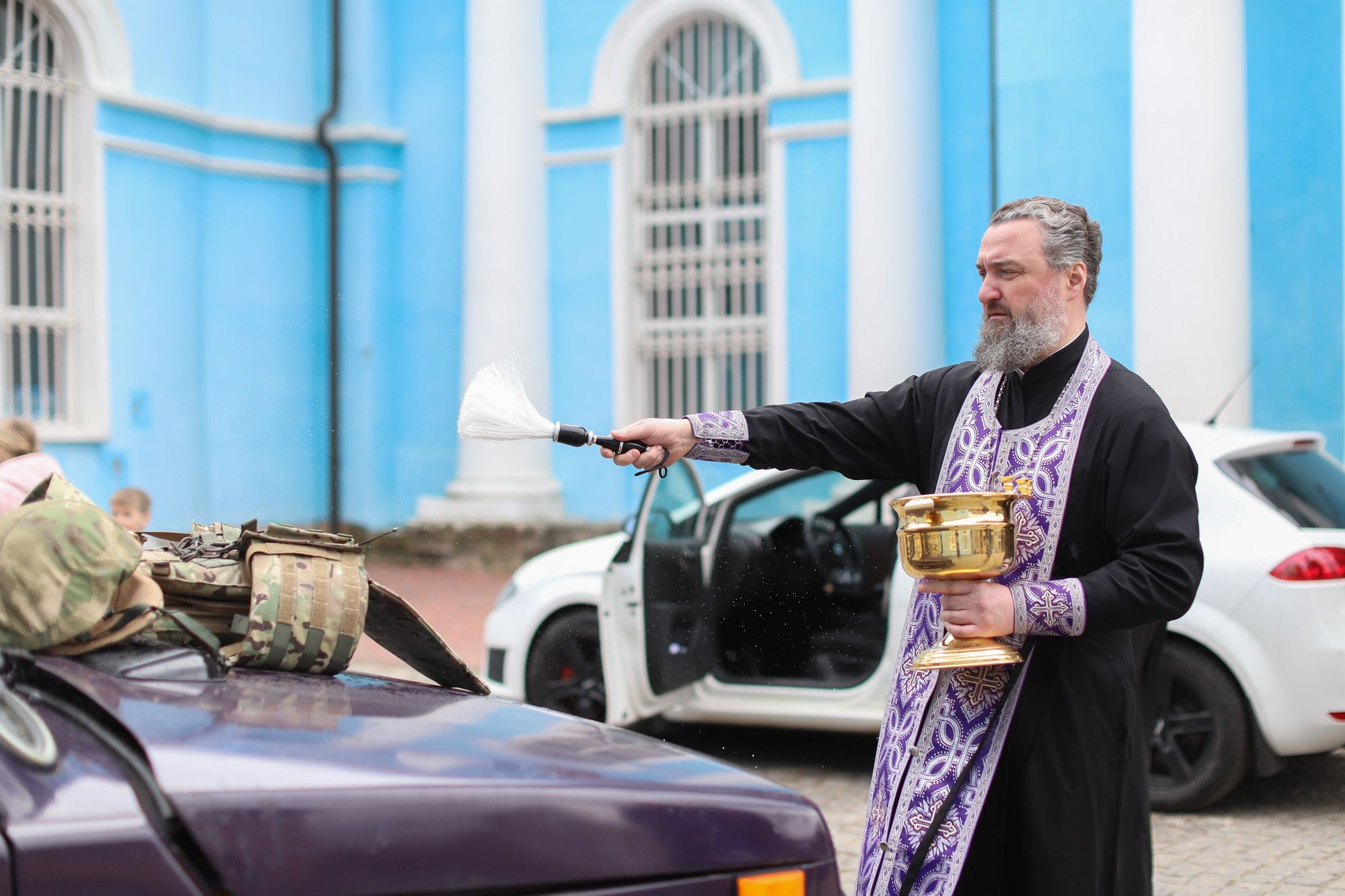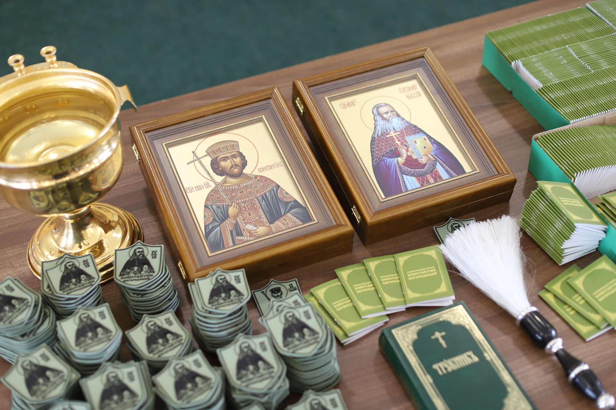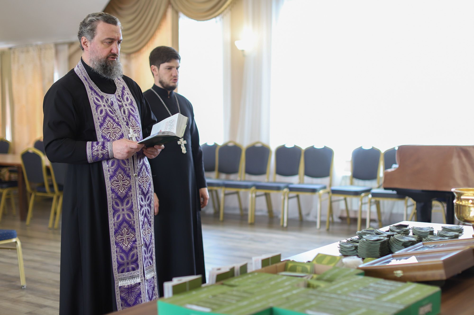 Перед отъездом миссии председатель Межъепархиального отдела Московской митрополии по взаимодействию с Вооруженными силами, правоохранительными органами и казачеством, благочинный церквей Богородского округа протоиерей Марк Ермолаев освятил батальонные иконы, шевроны с изображениями святых, чьим именем названы воинские подразделения, и книги о священномученике Константине Богородском, а также два внедорожных автомобиля и находящийся в них груз.