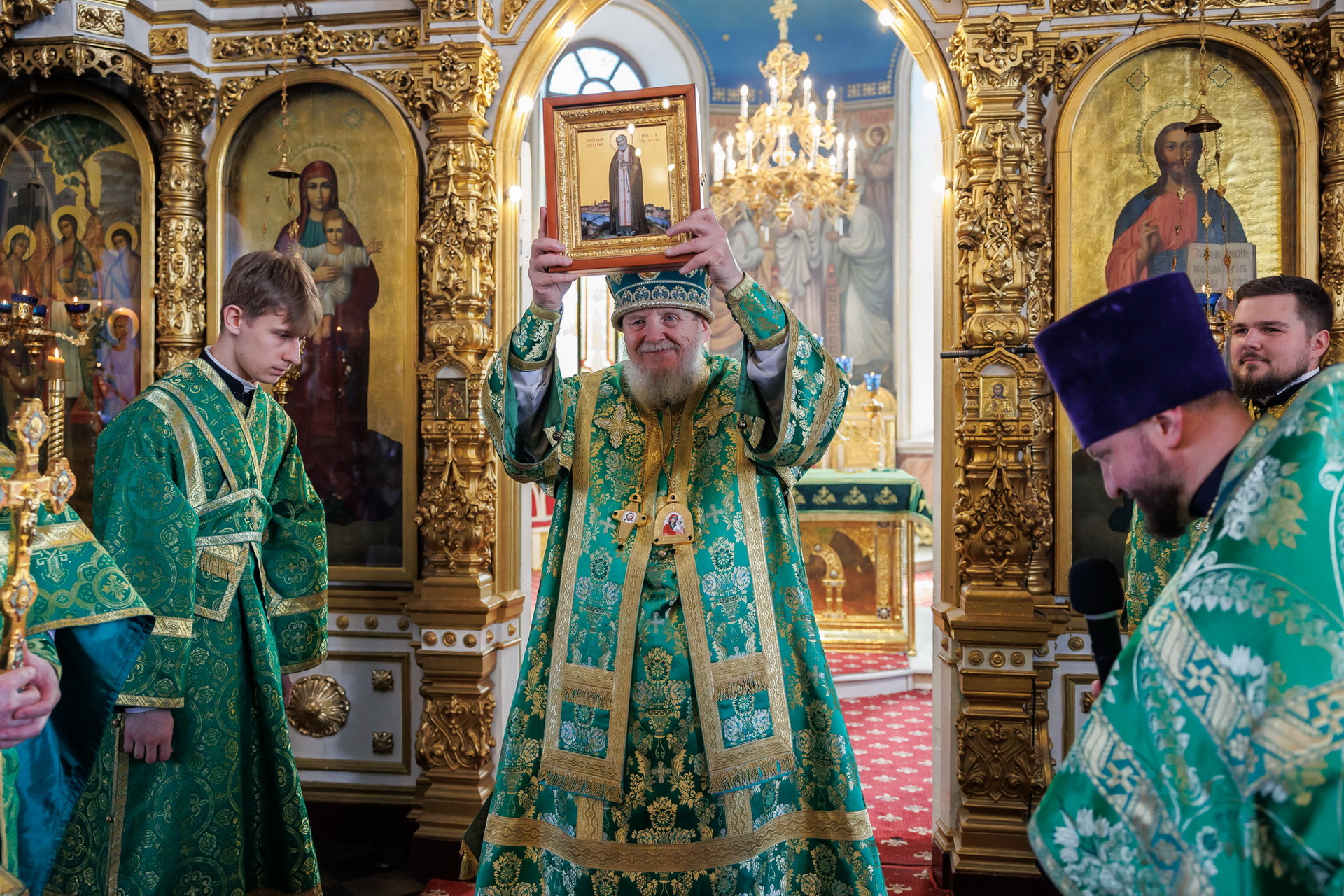 По окончании Литургии перед иконой праздника было совершено славление, после чего отец благочинный поблагодарил Владыку Николая за совершённое богослужение, за духовные наставления накануне Страстной седмицы и преподнёс ему образ преподобного Серафима Саровского.