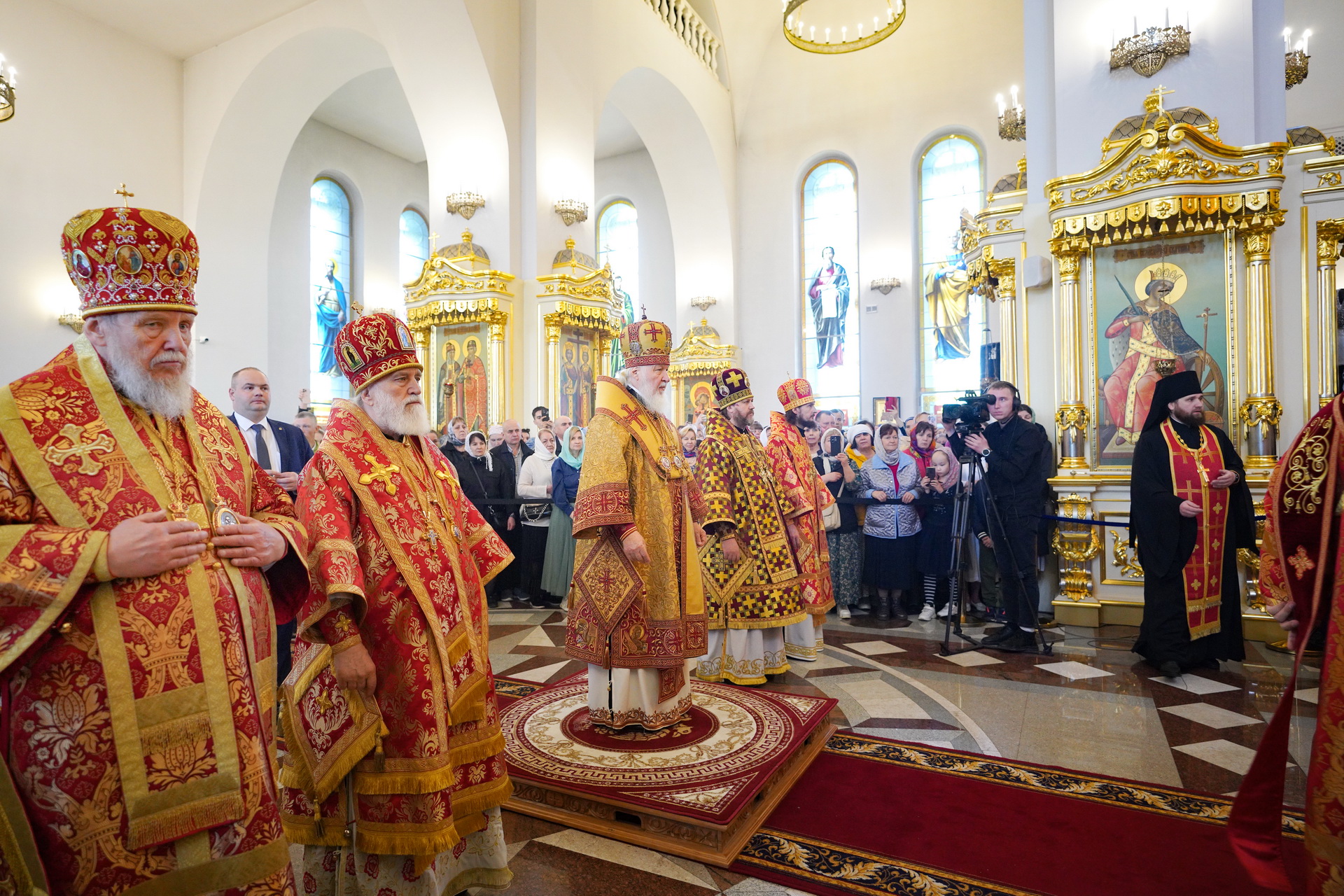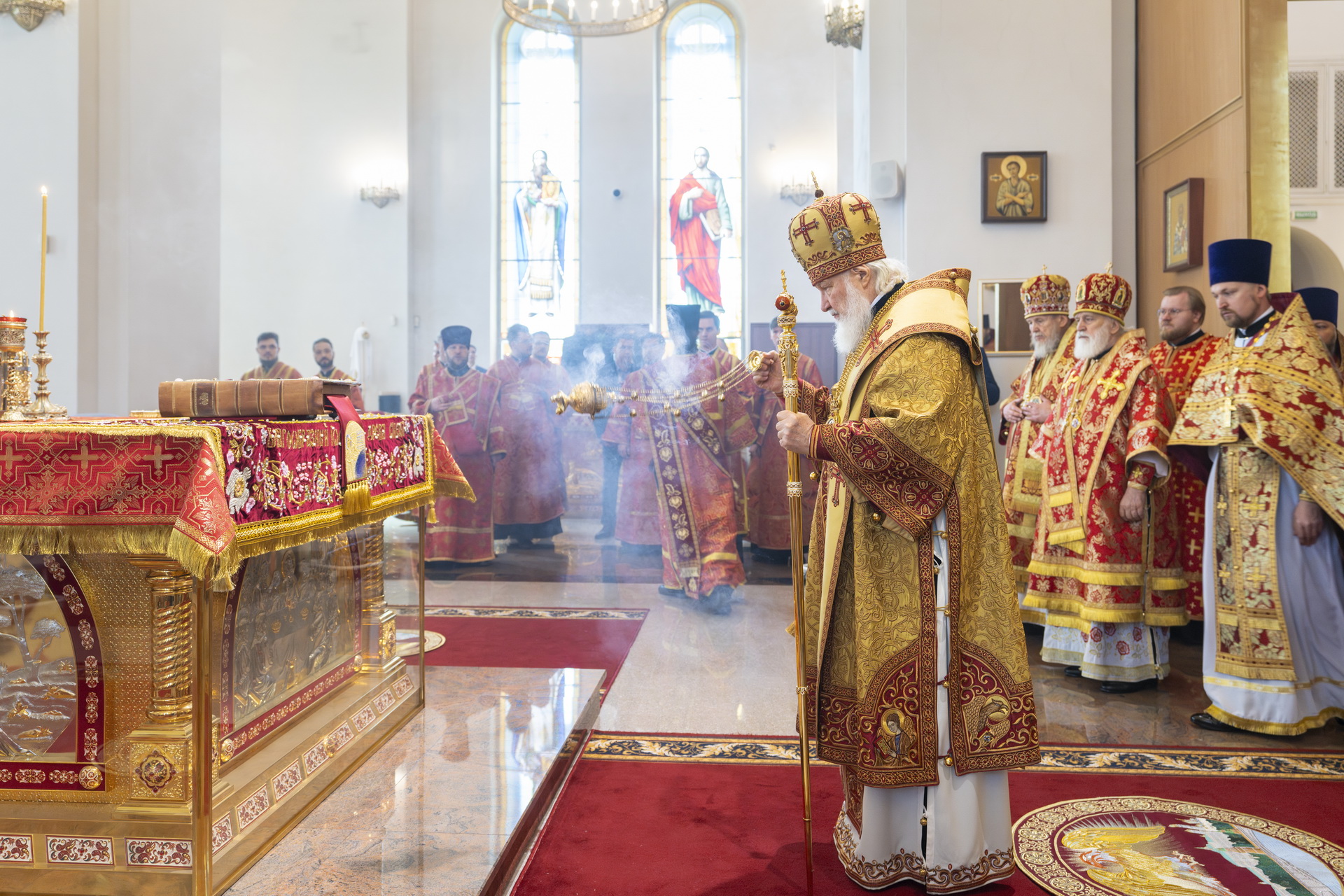 19 мая 2024 года, в Неделю 3-ю по Пасхе, святых жен-мироносиц, Святейший Патриарх Московский и всея Руси Кирилл совершил Божественную литургию в кафедральном соборе великомученика Георгия Победоносца в г. Одинцово Московской области (Одинцовская епархия Московской митрополии).