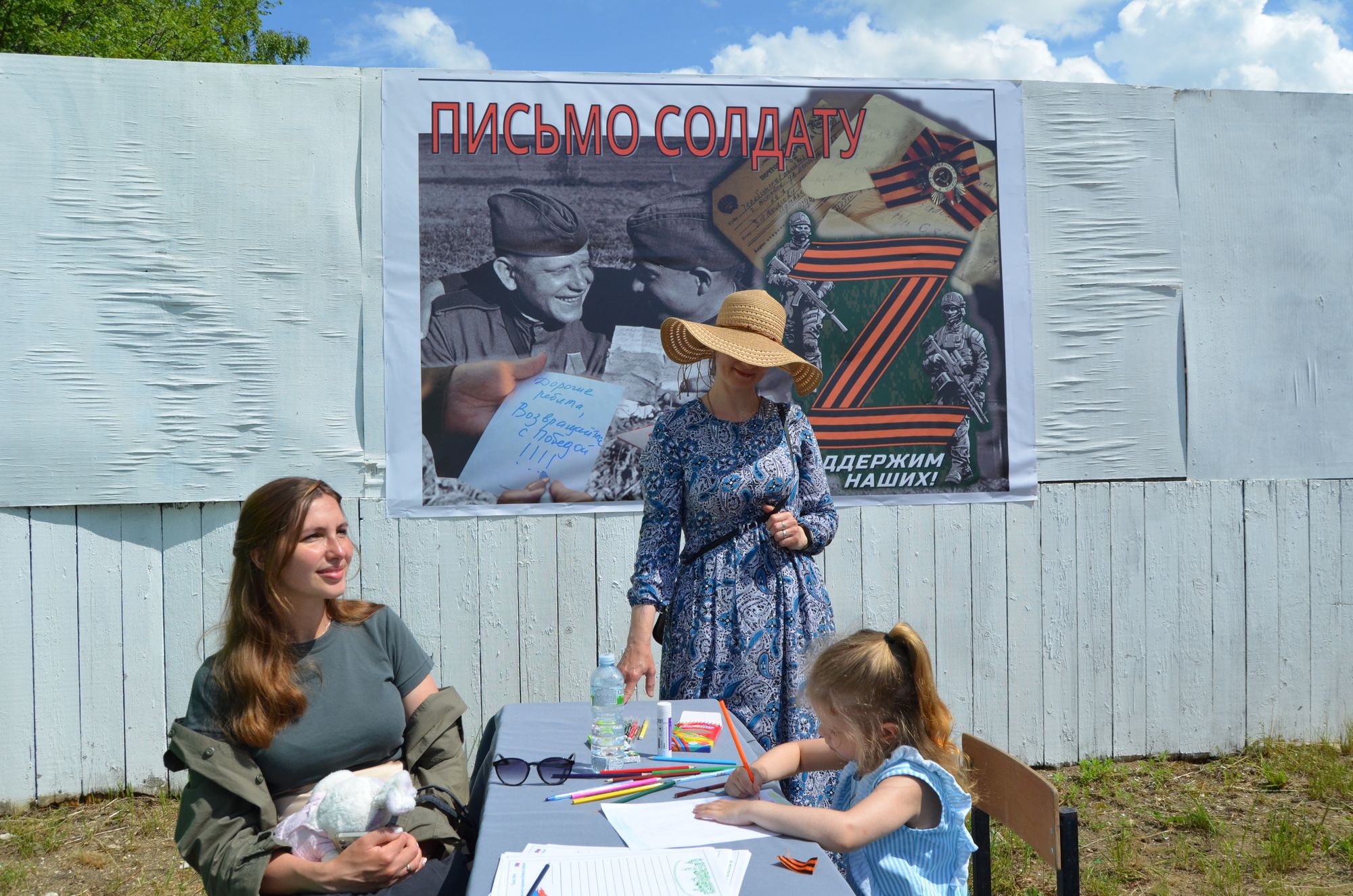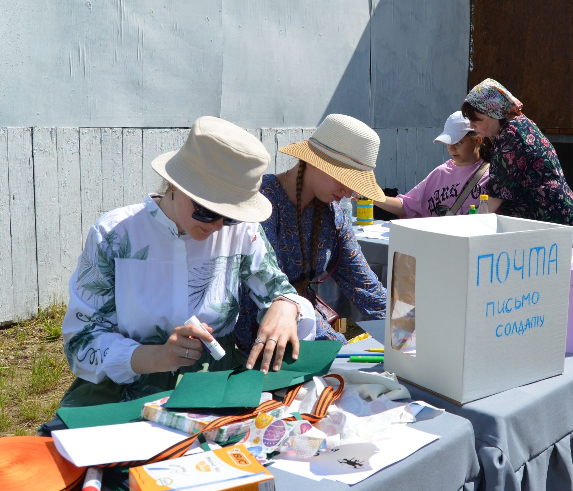 Во время фестиваля проводилась акция «Письмо солдату». Дети и взрослые писали слова поддержки воинам – участникам Специальной военной операции, дети рисовали рисунки, складывали треугольники и конверты.