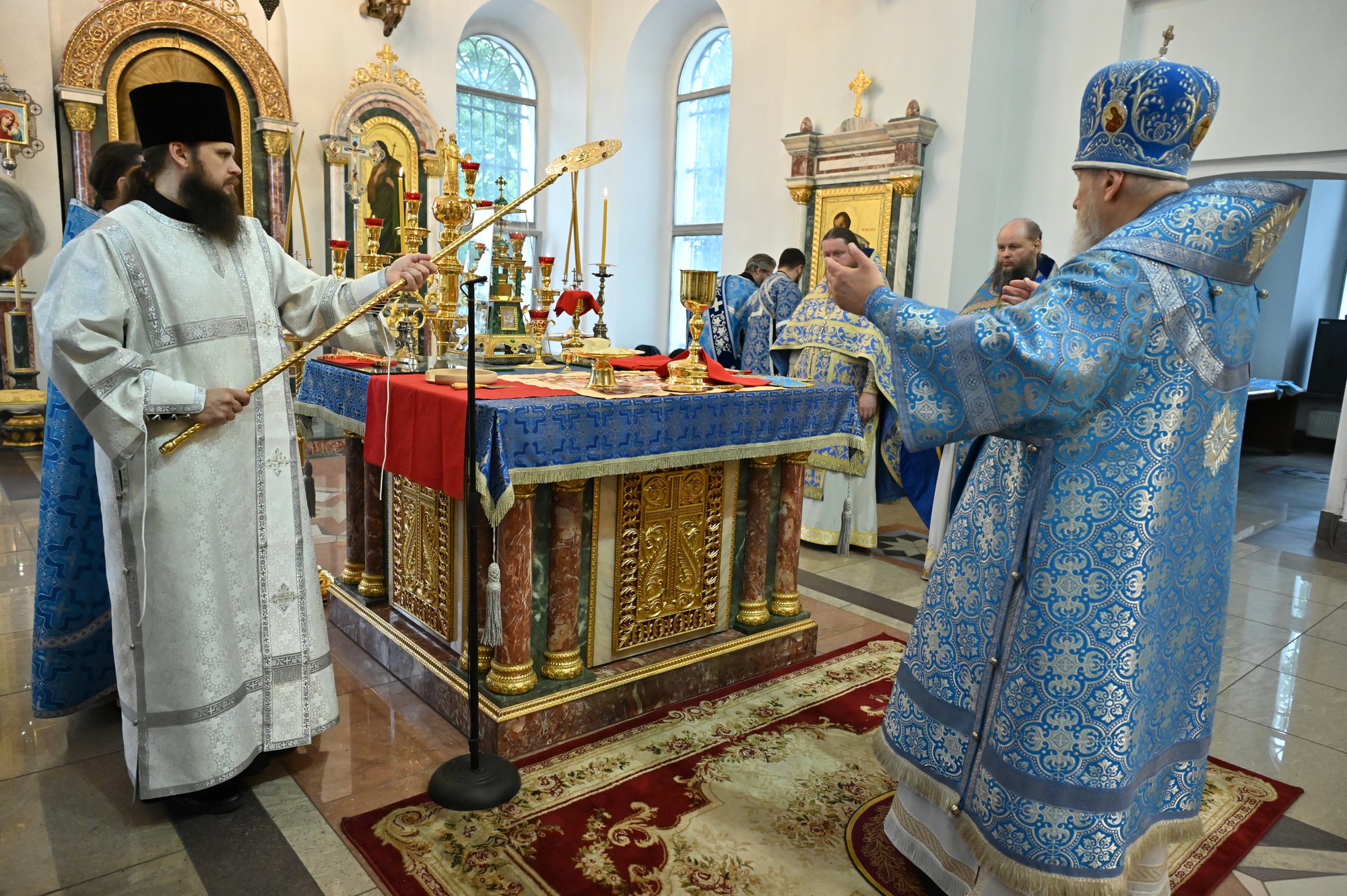 Его Преосвященству сослужили благочинный монастырей Балашихинской епархии и настоятель обители игумен Евмений (Лагутин), настоятель Покровско-Васильевского монастыря игумен Андрей (Тонков), настоятель Спасо-Преображенского Гуслицкого монастыря игумен Серафим (Голованов) и монастырское духовенство.
