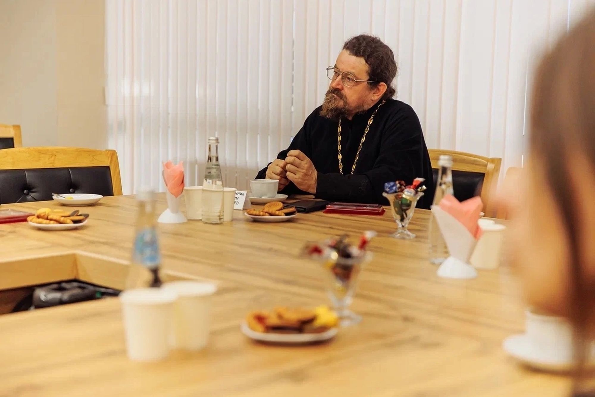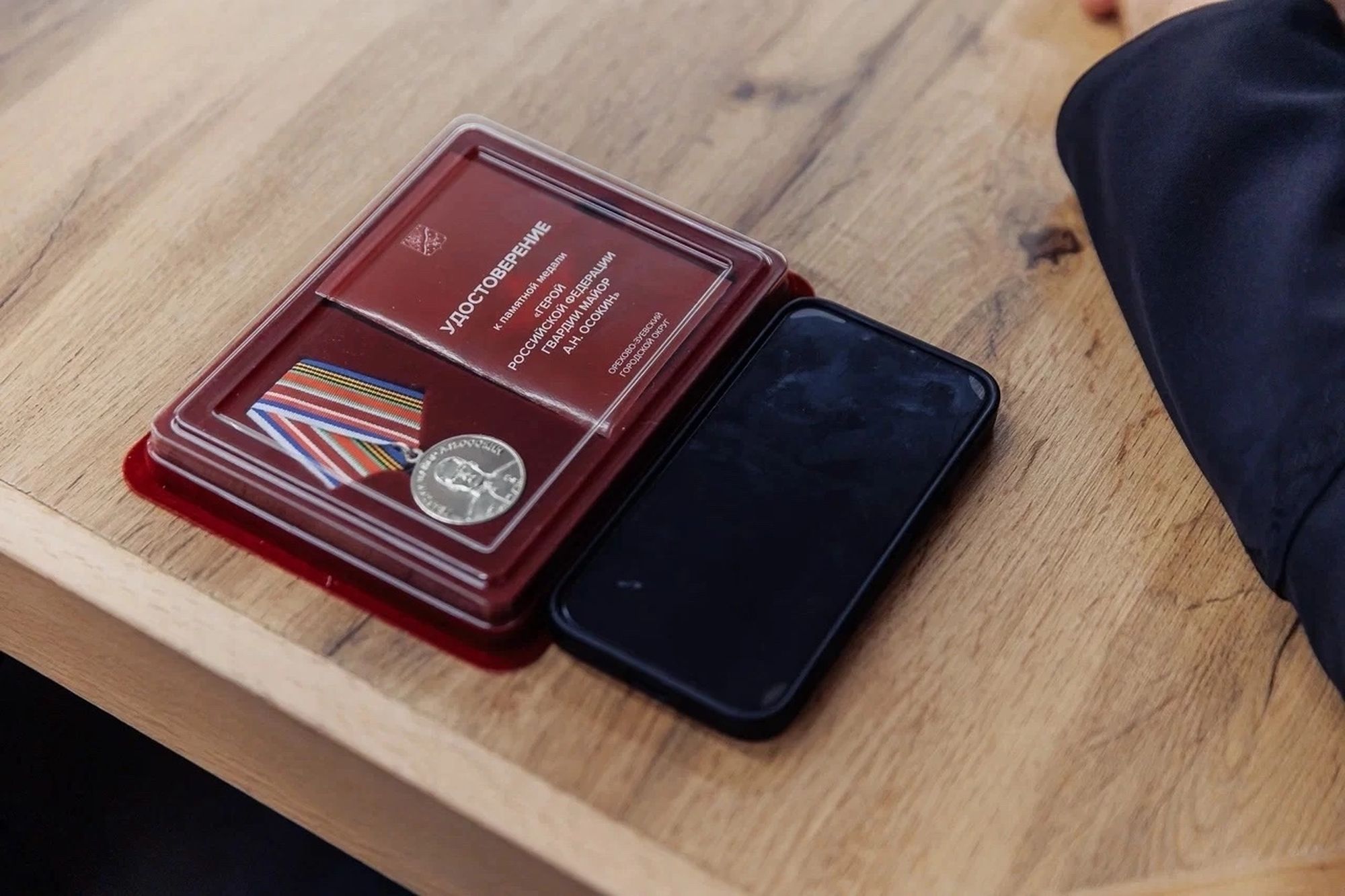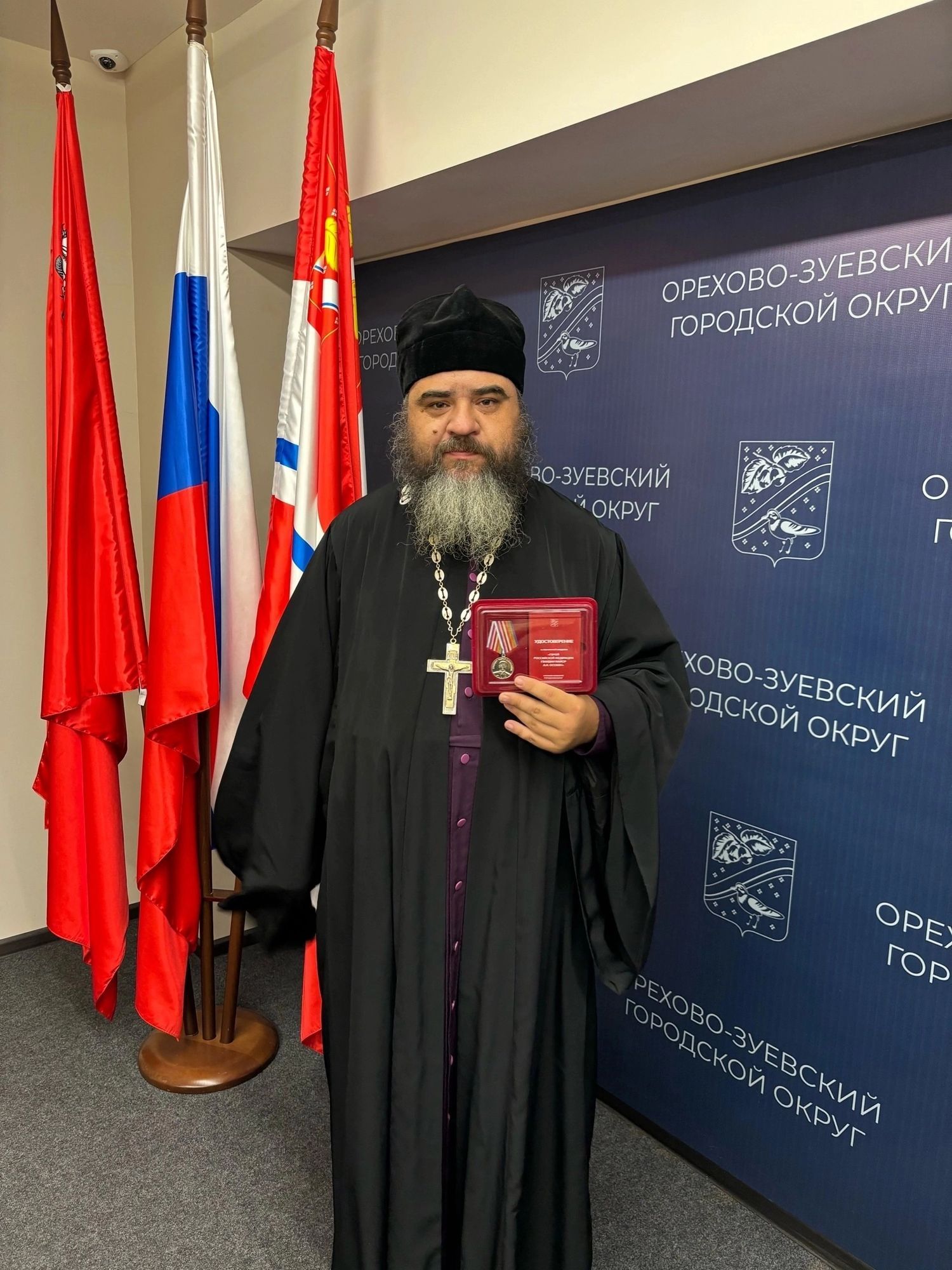 Н.Л.Осокин вручил благочинному Ликино-Дулёвского округа священнику Антонию Рыжакову именную награду памяти сына Медаль «Герой Российской Федерации гвардии майор А.Н.Осокин» за совместную помощь семьям участников СВО и организацию волонтёрской помощи.