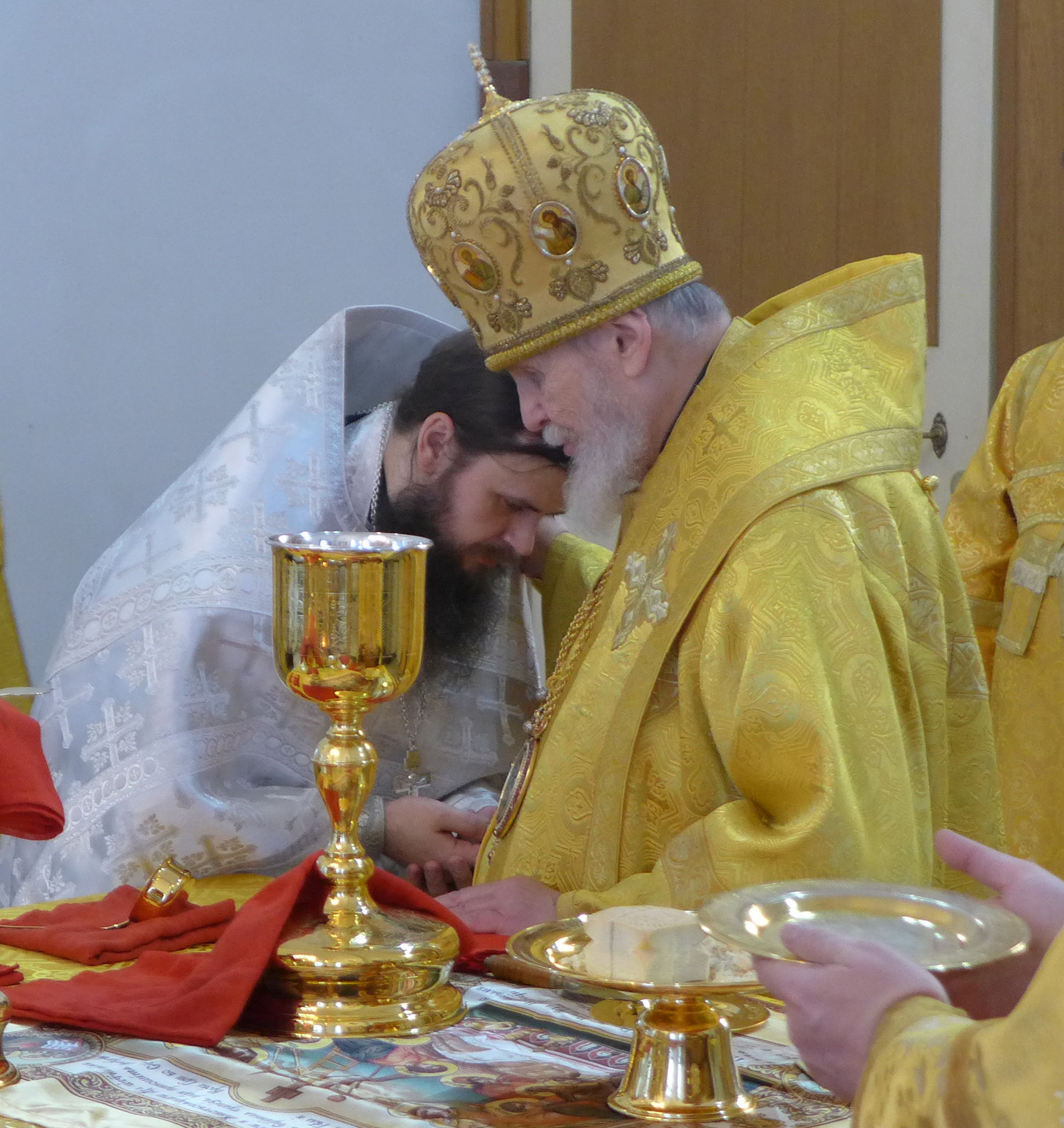 По заамвонной молитве были возглашены уставные многолетия, после чего отец Евмений поблагодарил Владыку Николая за совершённое богослужение и преподнёс ему икону Покрова Божией Матери.