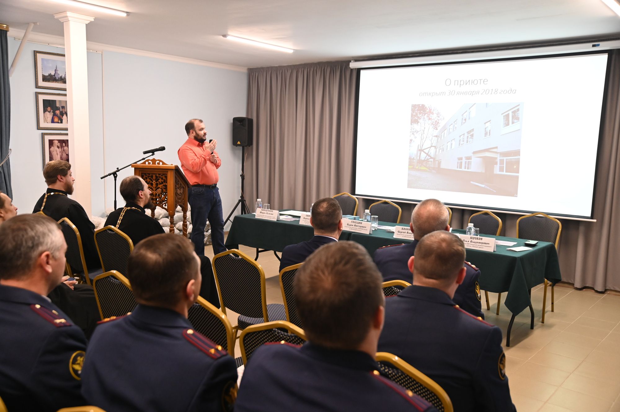 Перед присутствующими выступили первый заместитель начальника ГУФСИН России по Московской области Вадим Голудин, заместитель начальника ГУФСИН Сергей Коломыцев. О социальной реабилитации людей, освободившихся из мест лишения свободы, деятельности приюта «Тёплый приём» рассказал участникам директор социально-реабилитационного центра Илья Кусков.