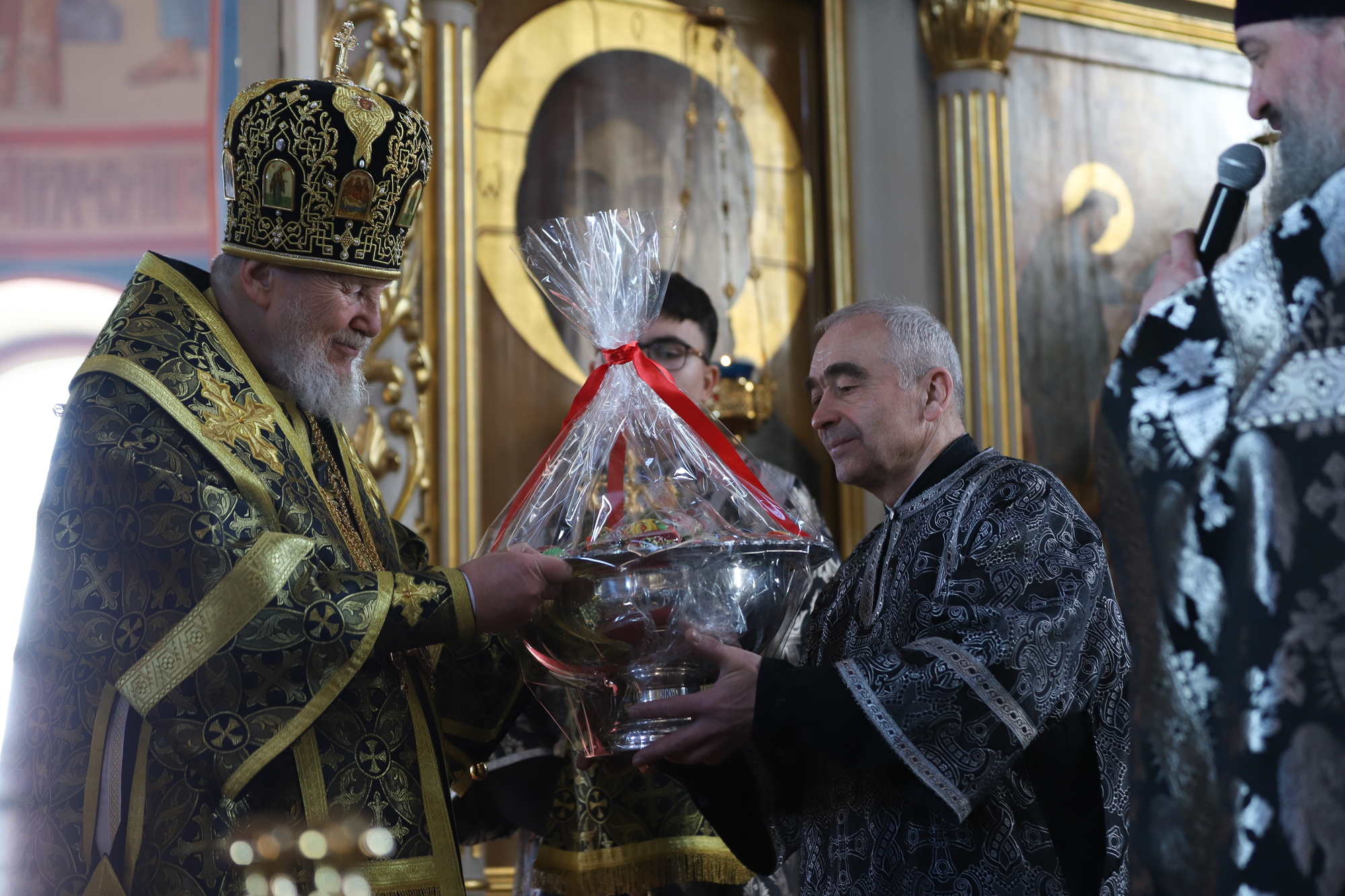 По окончании Литургии отец благочинный поблагодарил владыку Николая за совершённое богослужение и преподнес ему водосвятную чашу.