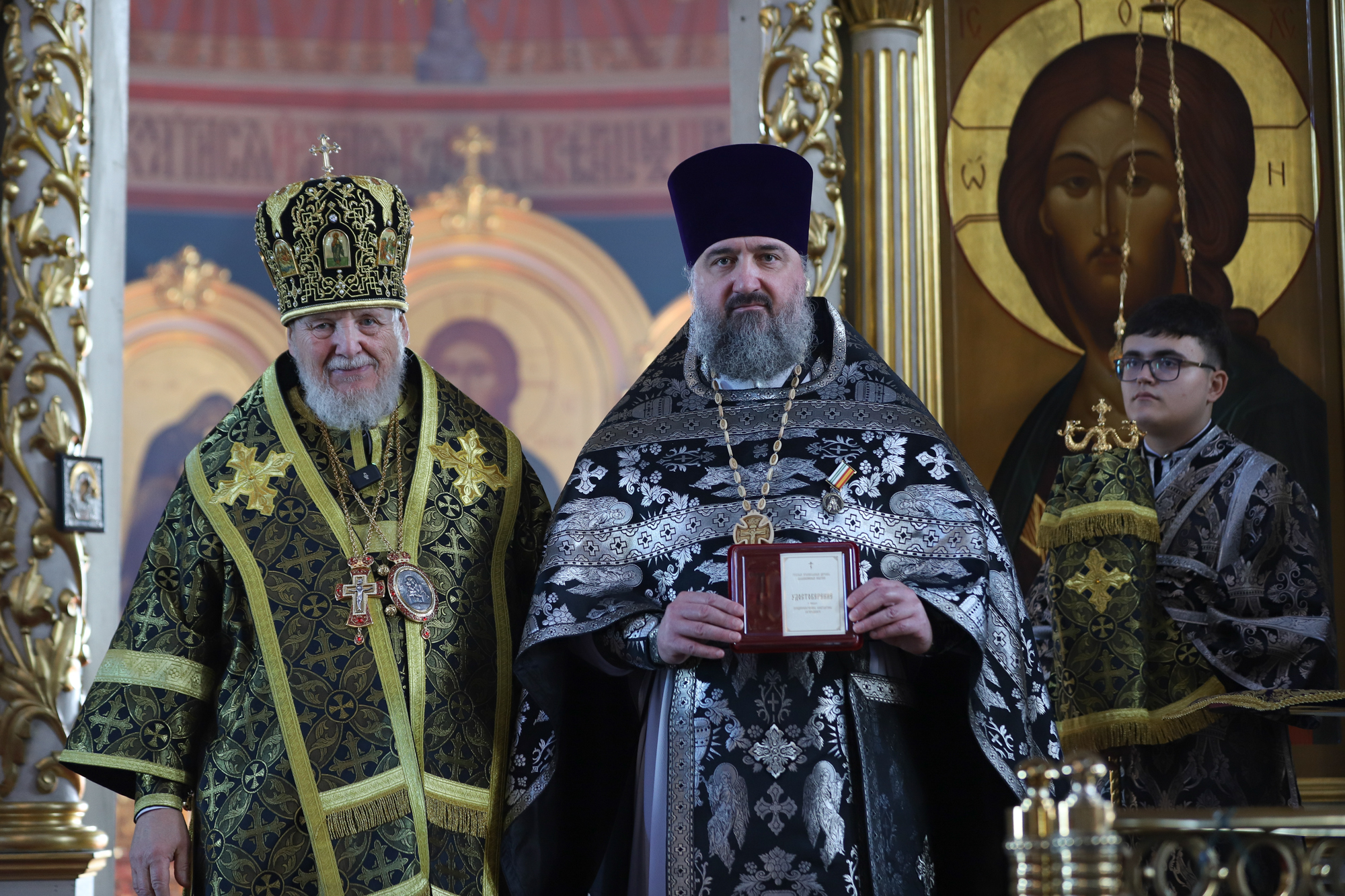 На малом входе Владыка Николай вручил настоятелю храма Собора новомучеников Богородских священнику Василию Алфееву за усердные труды на благо Святой Церкви и к празднику Святой Пасхи наперстный крест.