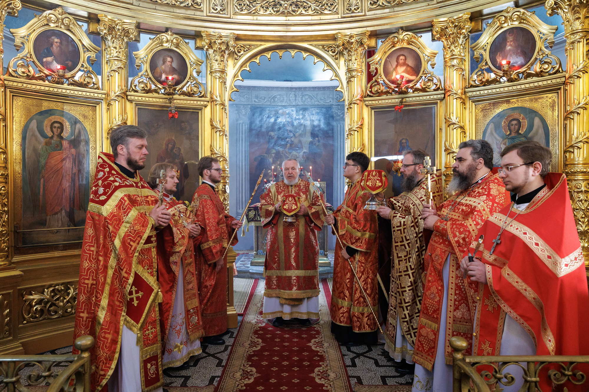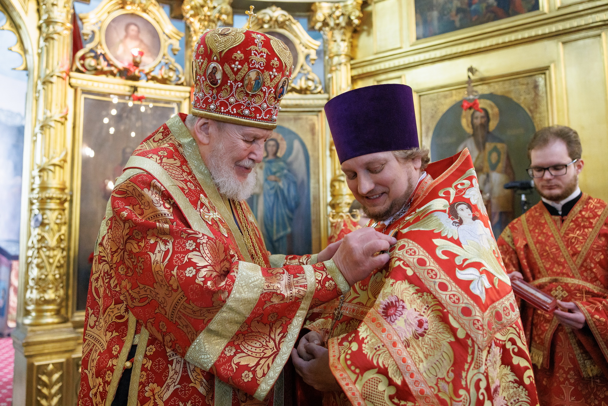 Отец благочинный поблагодарил архипастыря за совершенное богослужение, высокие награды и преподнёс ему евхаристический набор.