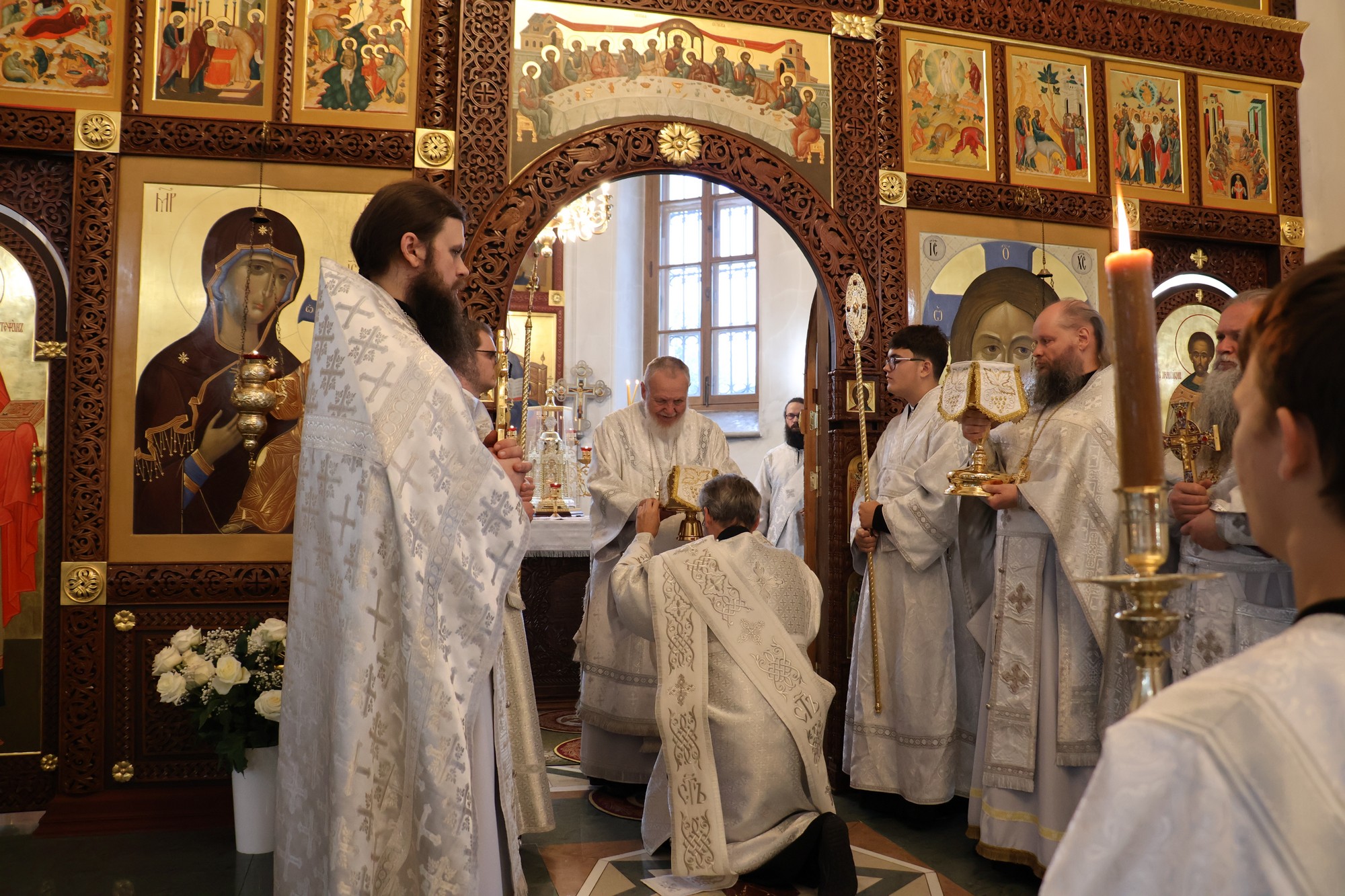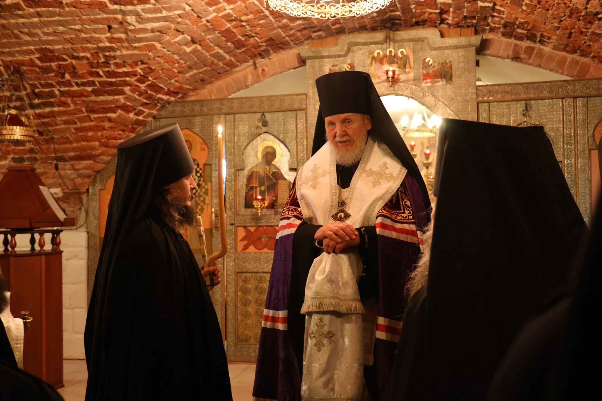 По заамвонной молитве были возглашены многолетия, после чего отец Евмений поблагодарил Владыку Николая за совершённое богослужение и преподнёс ему набор архиерейских свечей, привезённых из Соловецкого архипелага.