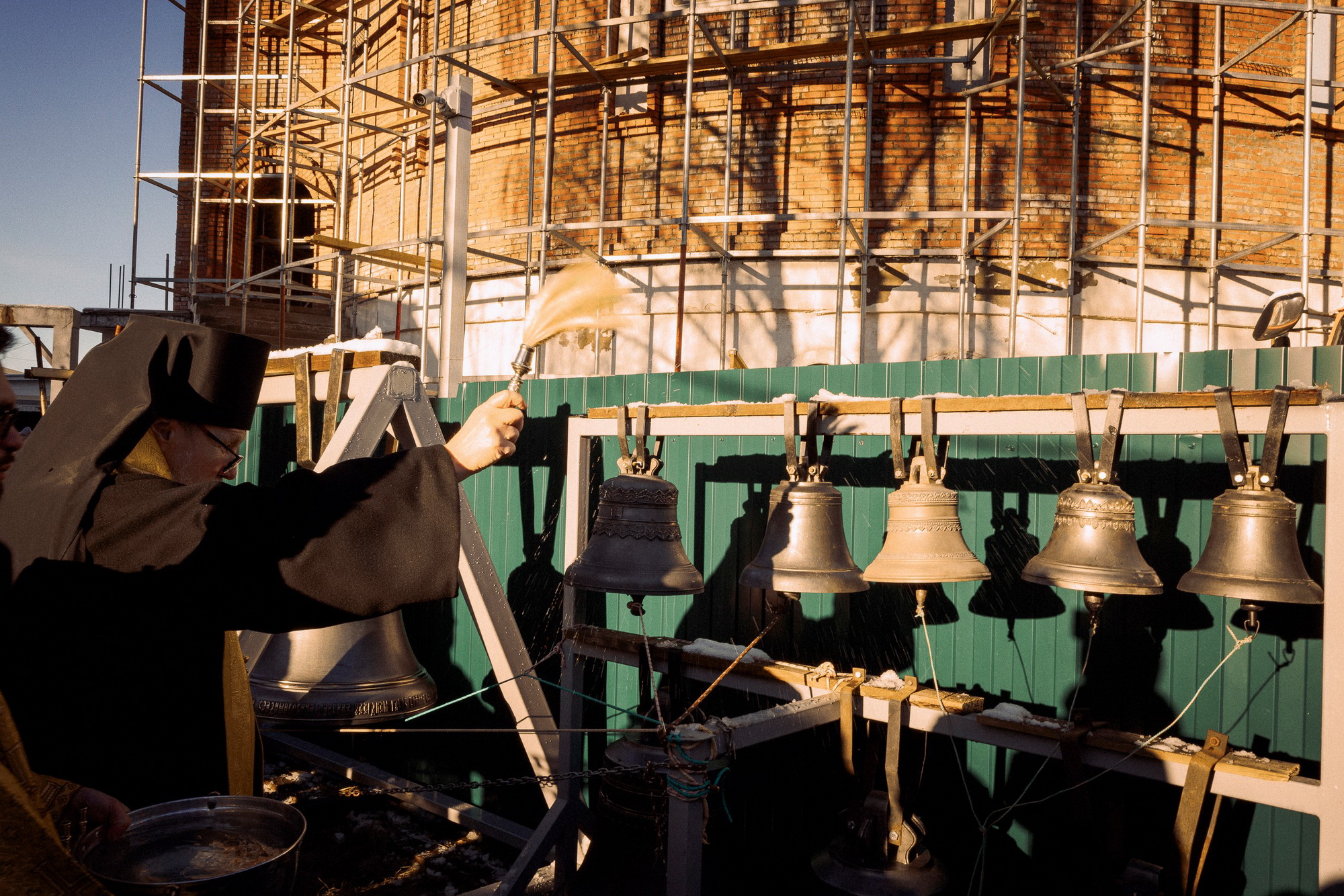 В этот же день владыка Николай совершил освящение накупольного креста и колоколов для строящегося каменного храма святых равноапостольных Кирилла и Мефодия.