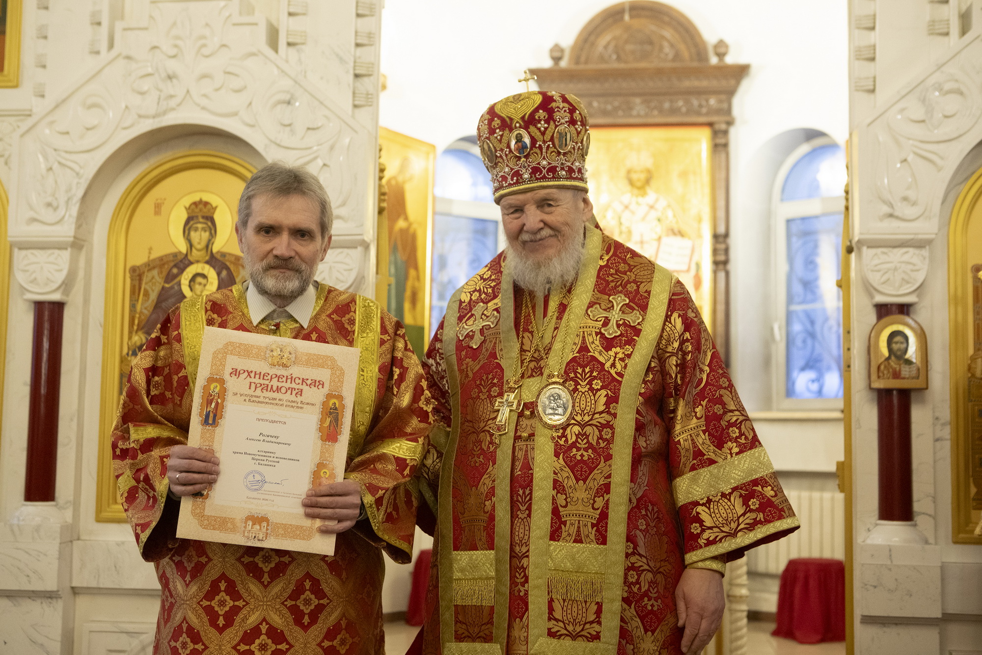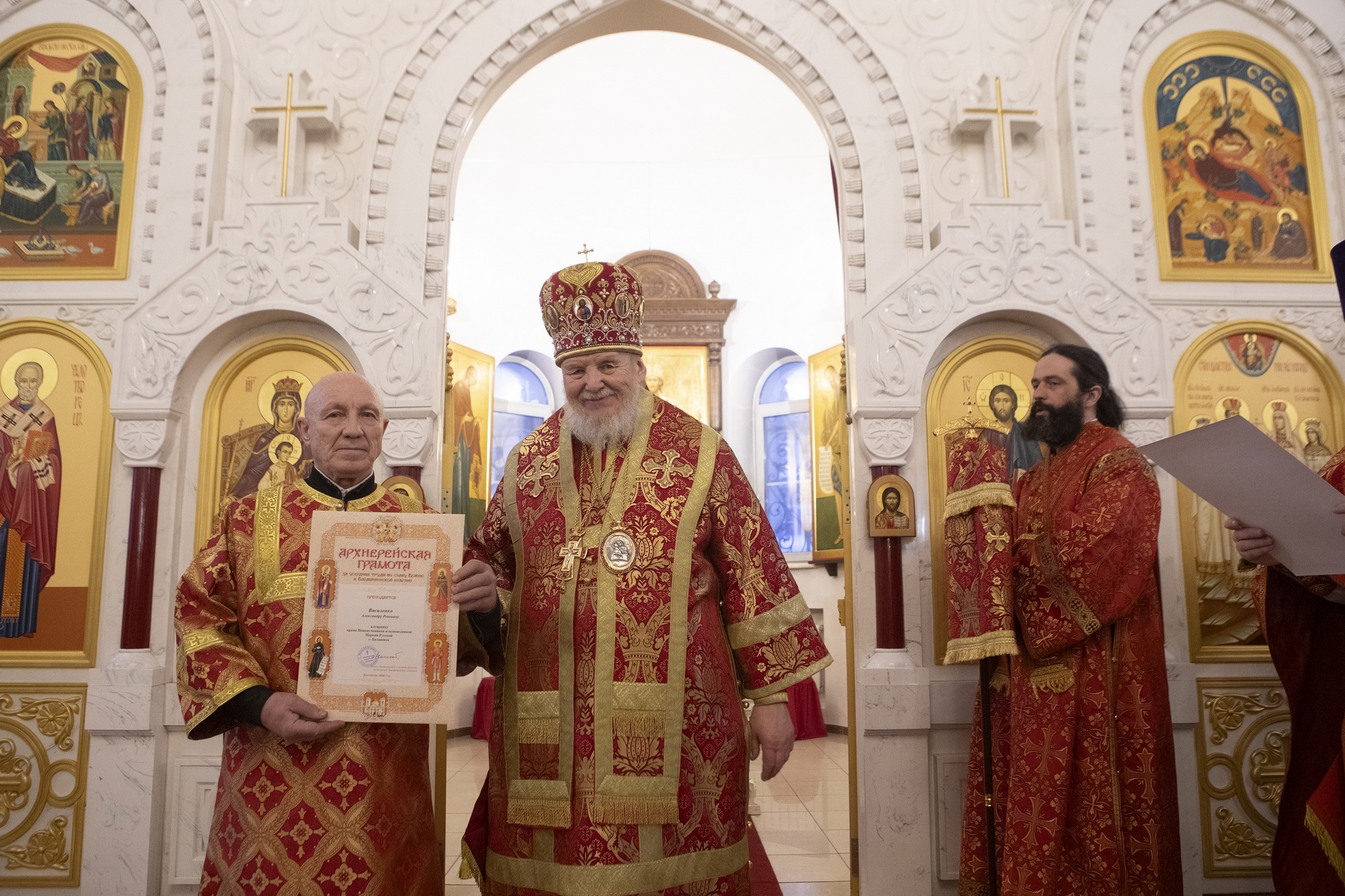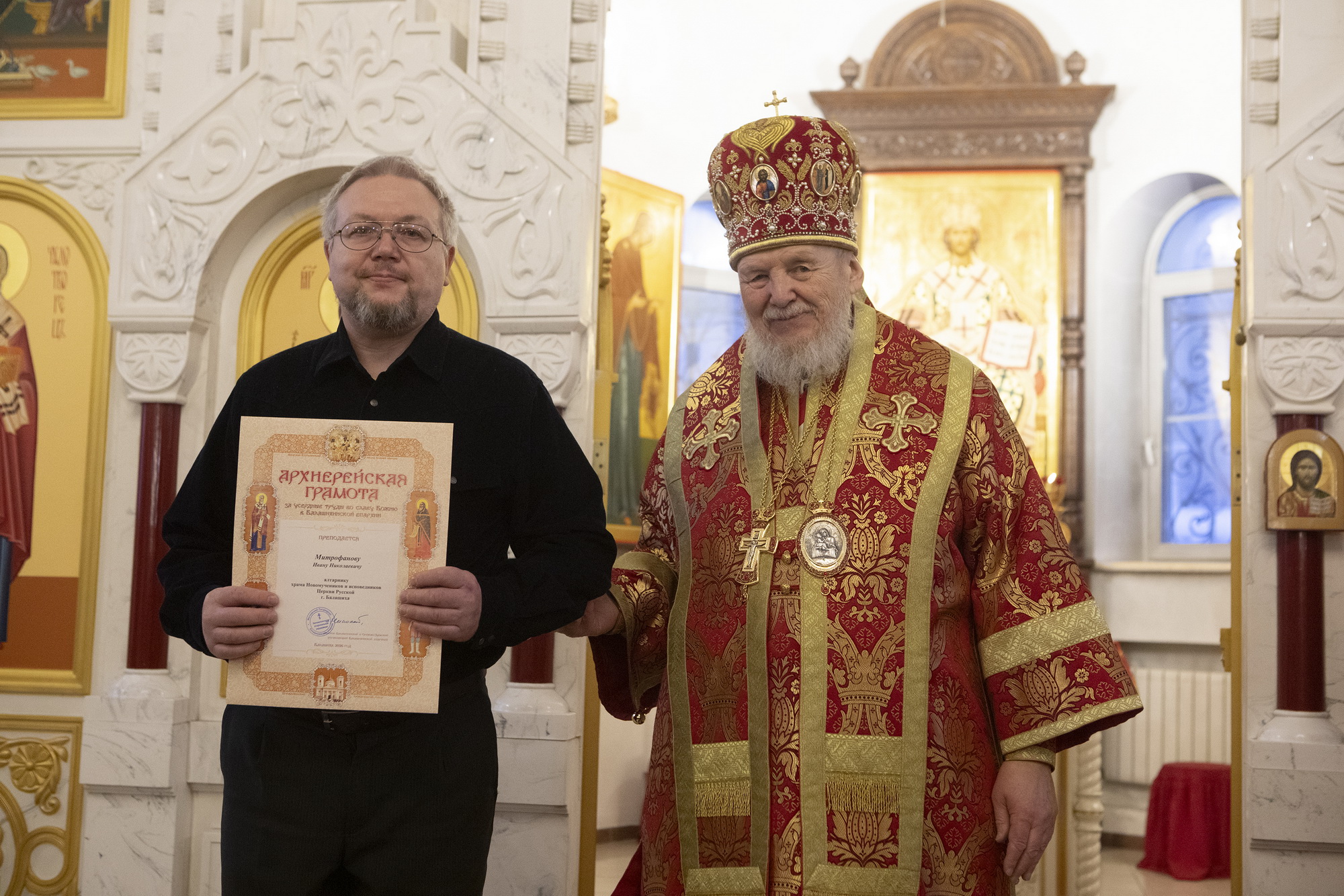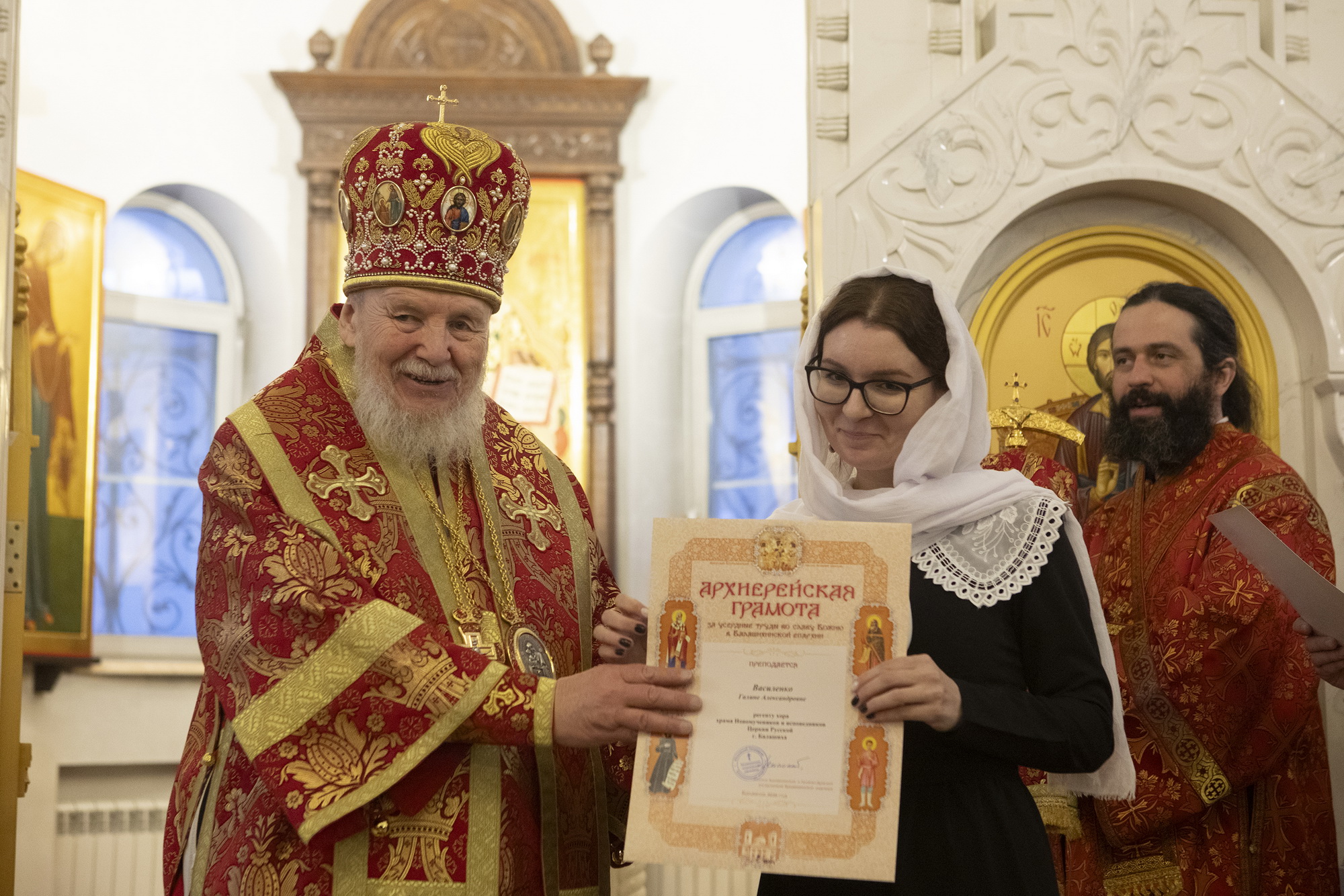 Затем Его Преосвященство обратился к духовенству и молящимся с архипастырским словом и вручил труженикам прихода архиерейские грамоты Балашихинской епархии.